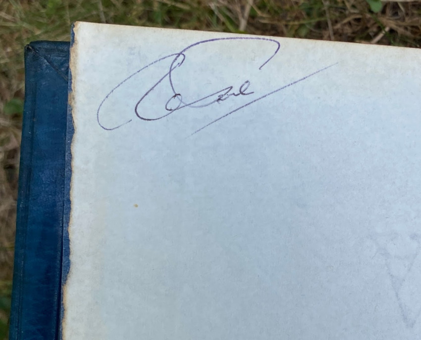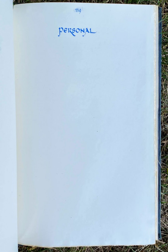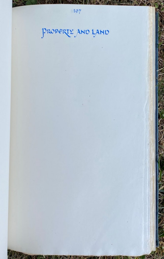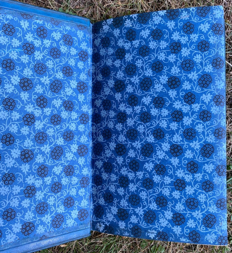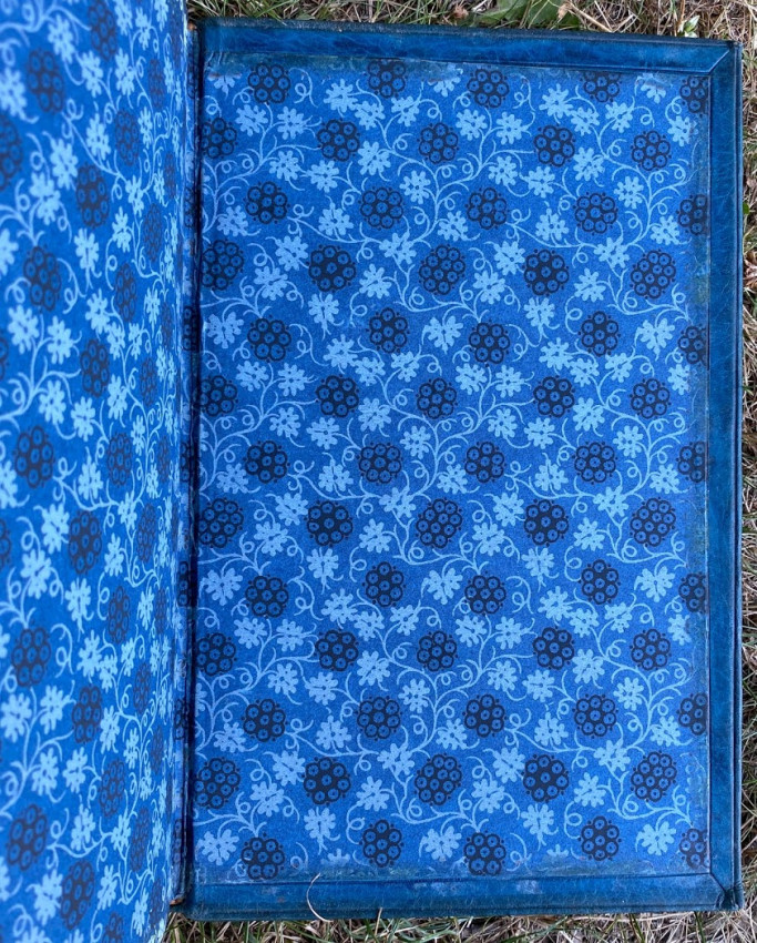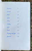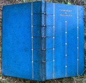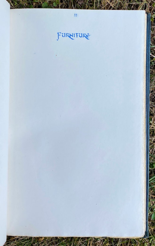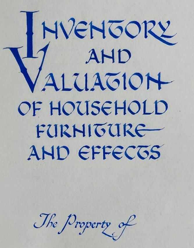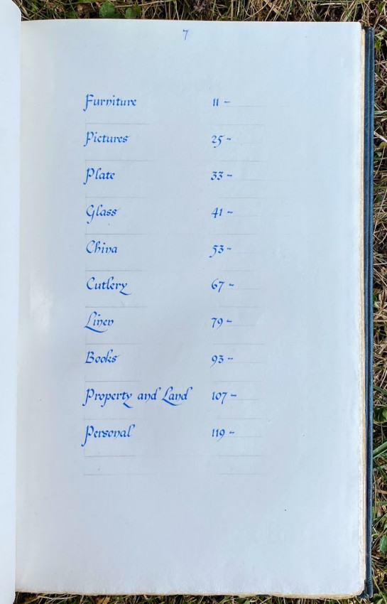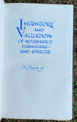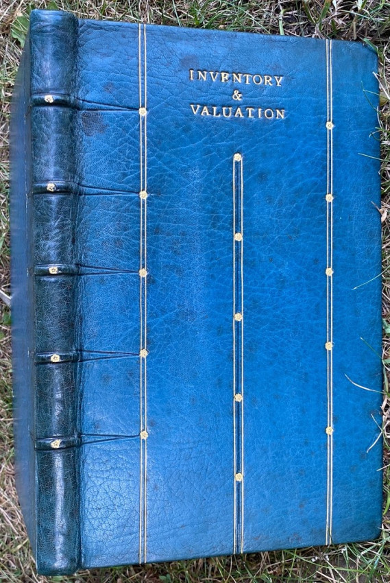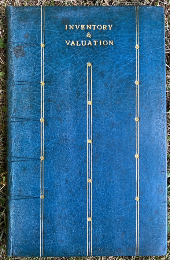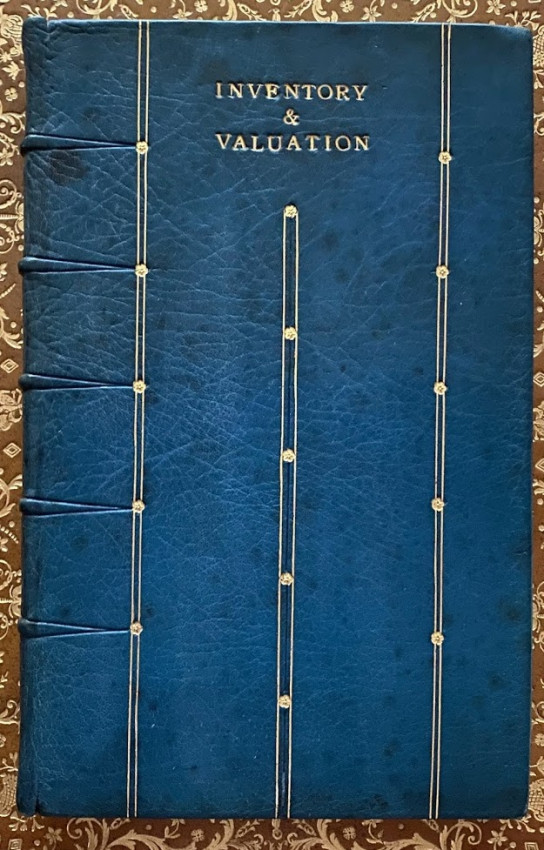 A prototype of an album designed to act as an "Inventory and Valuation of household furniture and effects", blank, except for the manuscript calligraphic title, and with various other calligraphic entries (all in blue ink): sub-headings & page numbers, and final entry, at the foot of the final page: "Designed and written by Edith C. Goodwin". [England: c. 1920s]. Octavo (9 x 5 5/8in; 228 x 143mm), on fine 'W. King / Alton Mill' wove paper. Pp. [i-v; 1-]7-136[-141] with pages 7-136 with manuscript calligraphic pagination in the middle at the top of each page, p.7 has a full-page index of where the 10 sub-sections start: ie: 'Furniture' p.11; 'Pictures' p.25; 'Plate' p.33; 'Glass' p.41; 'China' p.53; 'Cutlery' p.67; 'Linen' p.79; 'Books' p.93; 'Property and Land' p.107. There is one further section'Personal' which starts on p.119 and is not included in the index. There is a pencilled not on p. [ii] - see below. Blue morocco, tooled in gilt and blind [see images], turn-ins ruled in blind, patterned endpapers, top edges gilt (some light discoloration)