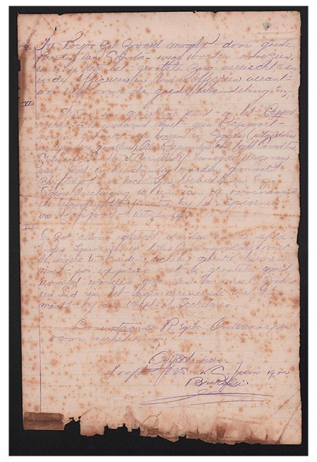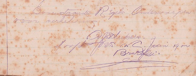 Written by Gideon Scheepers and sent by the State Messenger to Hennings Korps requesting certain men for a planned attack on the British forces. He lists 7 individual requests including one for 50 able bodied healthy young men to join him, 1 captain, 2 lieutenants, 3 sergeants, and corporals. It is signed by him as Head of the O.F.S. Command and dated June 1900 at Brandvlei.