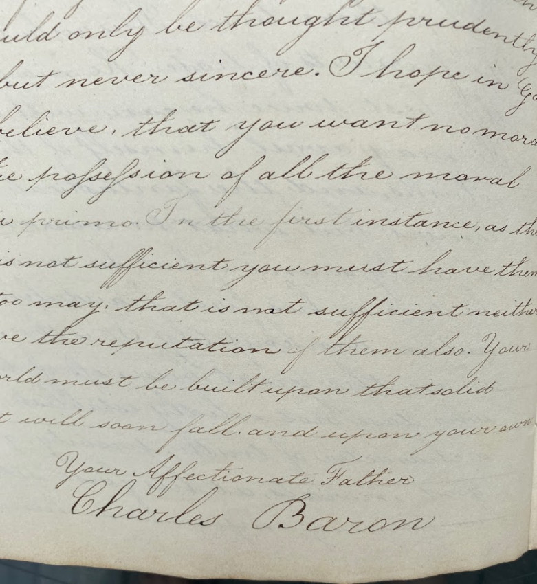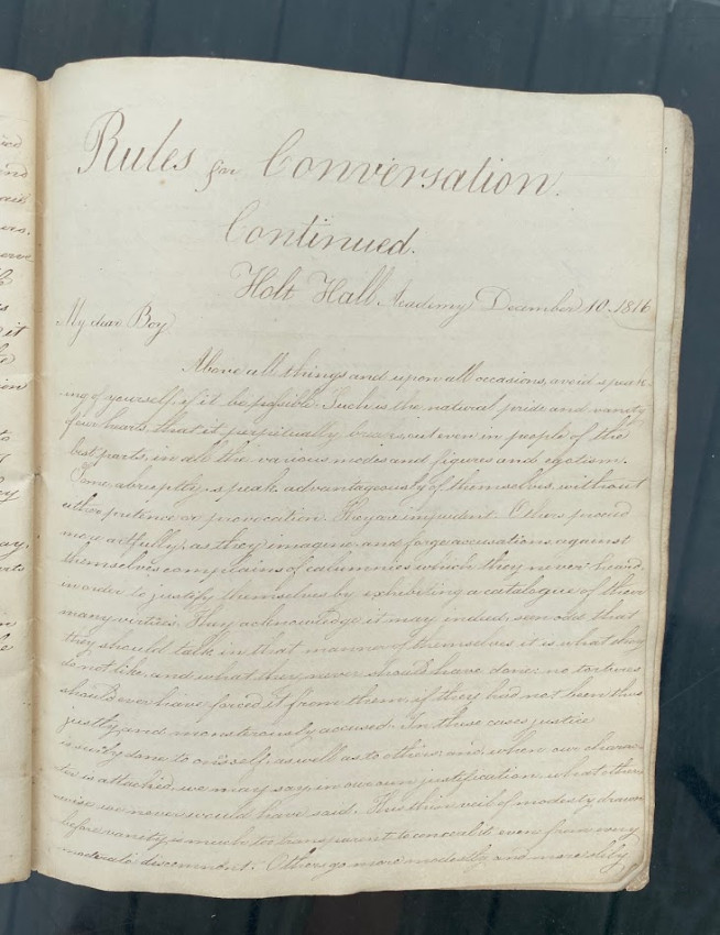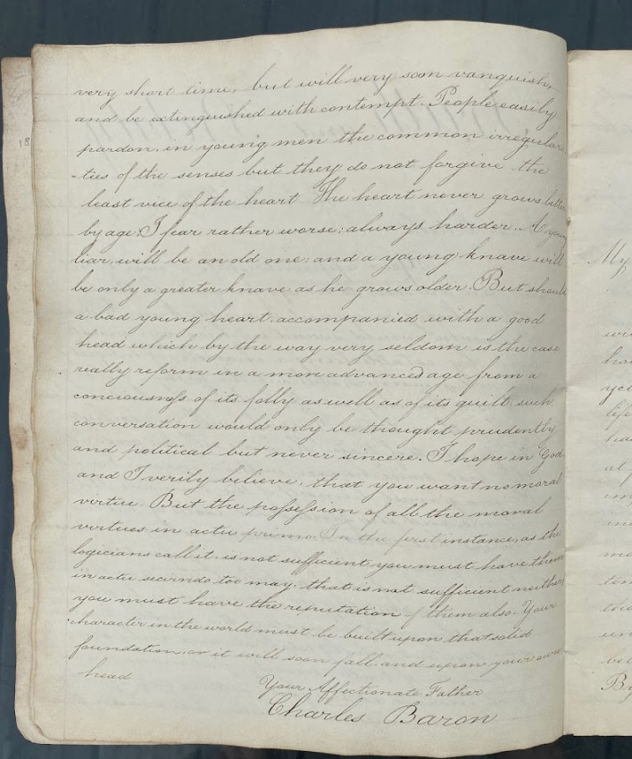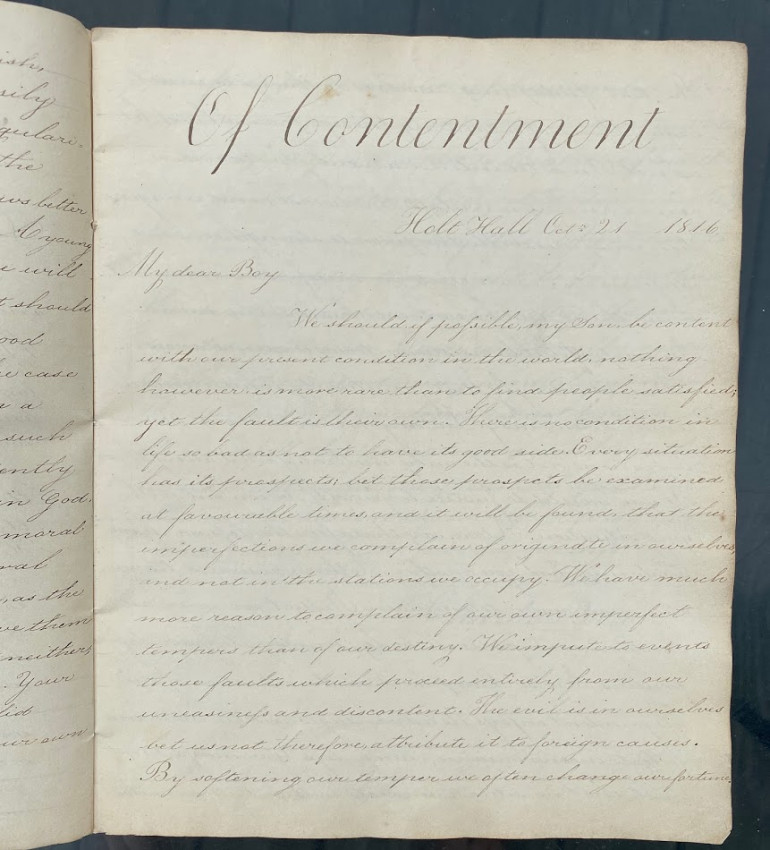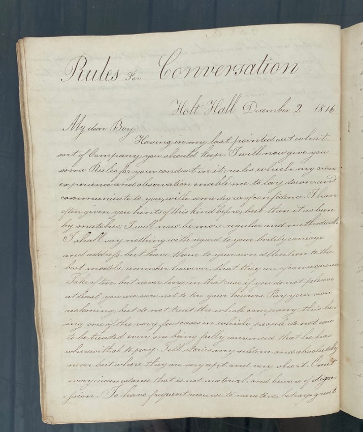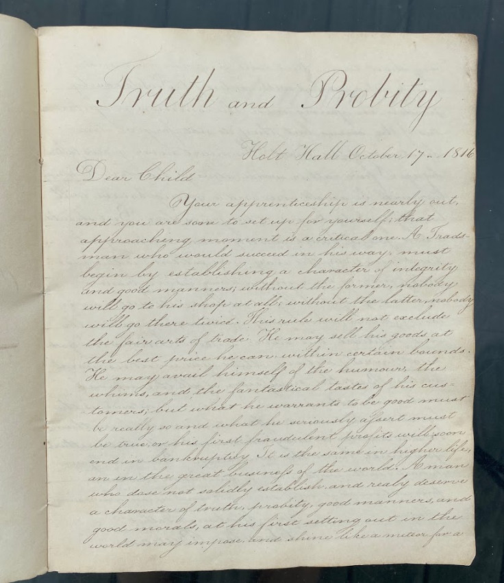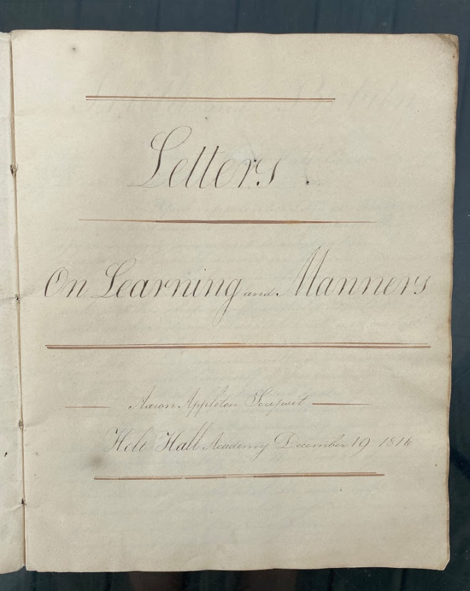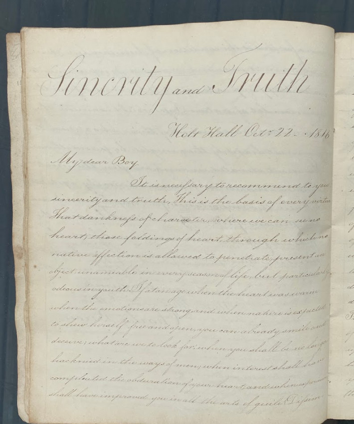 Manuscript “Letters / On Learning and Manners. / Aaron Appleton sculpsit / Holt Hall Academy December 19 1816.” [Prescot, Lancashire, England: entries dated from 17 October – 10 December 1816, watermarked ‘Whatman / 1814’]. Quarto (10 1/8 x 8 1/4in; 258 x 210mm), manuscript calligraphic title (verso blank), 43 unumbered pages. The text in the form of calligraphic copies of 14 letters apparently from Charles Barron to ‘Dear Child’, ‘Dear Boy’ or ‘My Dear Boy’, all signed ‘Your affectionate Father / Charles Baron’.
