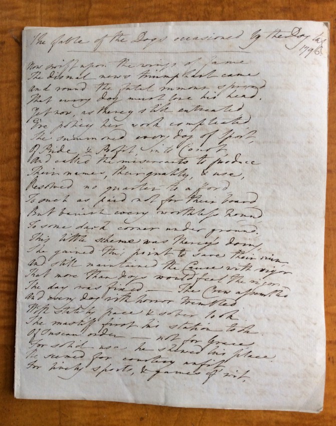 7pp. manuscript poem, titled 'The fable of the Dogs occasioned by the Dog tax 1796'