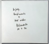 Published to commemorate Nelson Mandela's Presidential Inauguration. Inscribed, dated and signed by Nelson Mandela. Dust jacket is torn along lower edges. 60p. Photograph on every other page. Book measures 27.5cm X 25cm.
