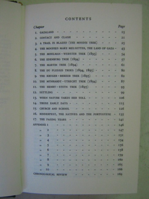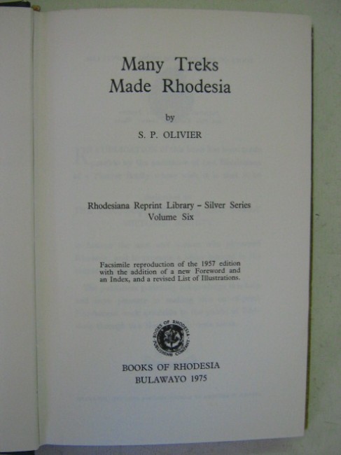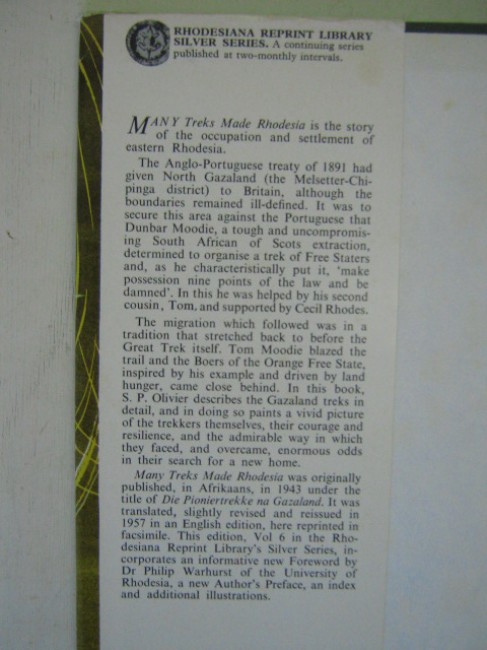 Rhodesiana Reprint Library - Silver Series, Vol.6: The occupation and settlement of eastern Rhodesia, dealing with the treks of Dunbar Moodie, Moolman-Webster, Edenburg, Martin, Du Plessis, Kruger-Bekker, Mynhardt-Utrecht, and Henry-Steyn; with notes on the Rinderpest, the Natives, and the Portuguese; 170pp. including appendix. Book condition: green boards, silver spine and cover titles, very good condition, top edge spotted and faded. Jacket condition: good, spine faded, wear to extremities, top edge chipped and worn.