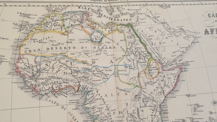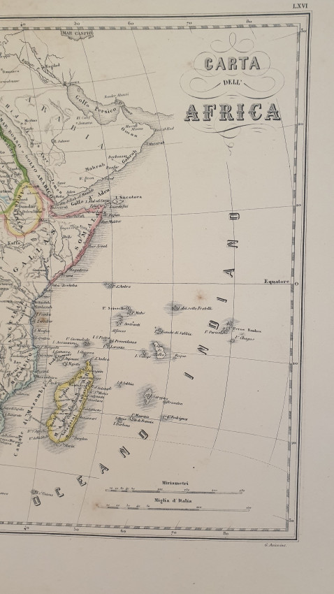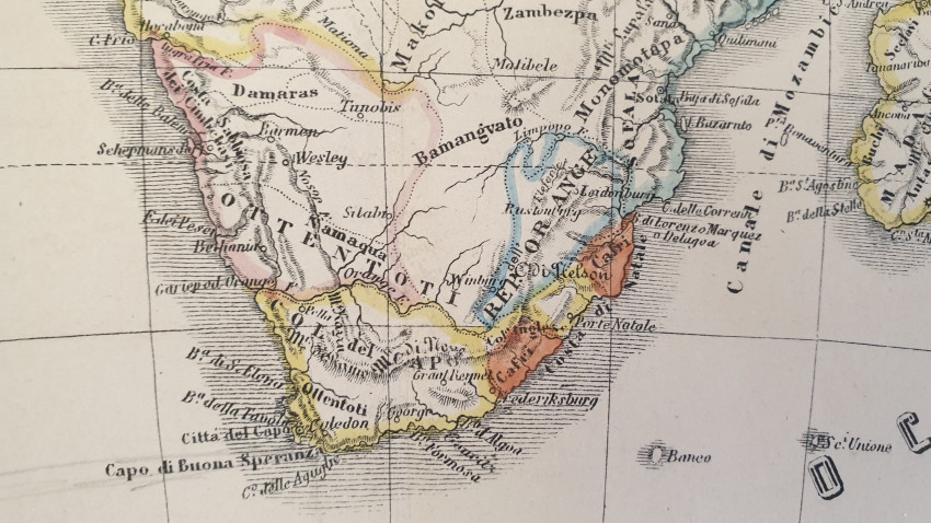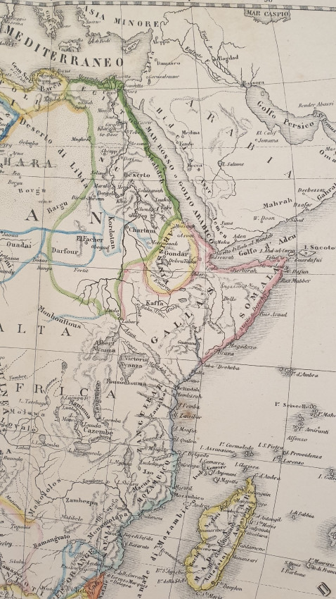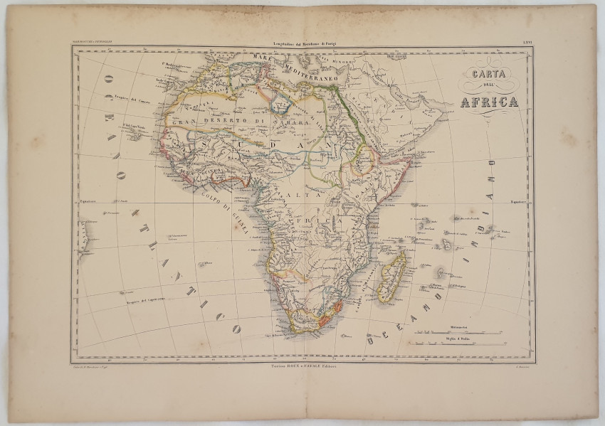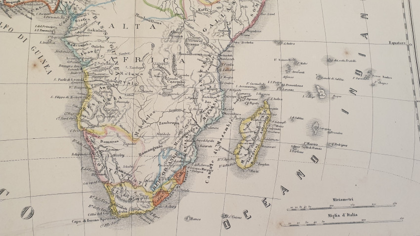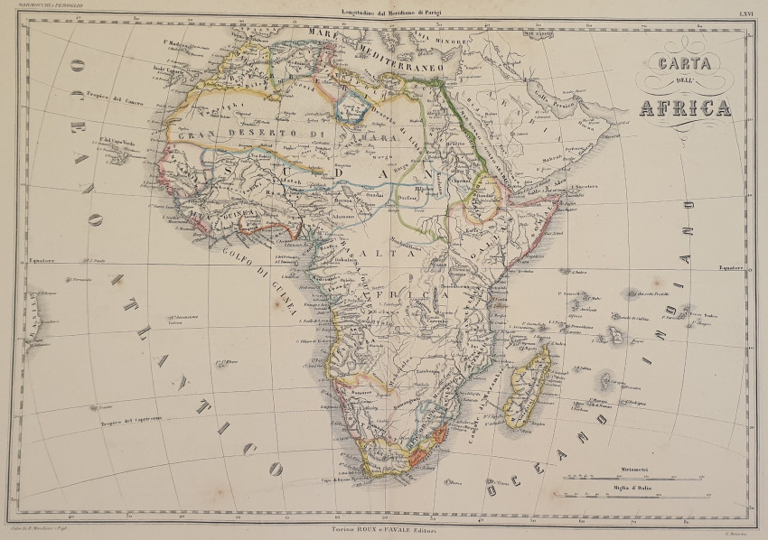 View of Africa of 1878 by Celestino Peroglio. There is also the island of Madagascar and the indication of Cape of Good Hope. Coeval coloring