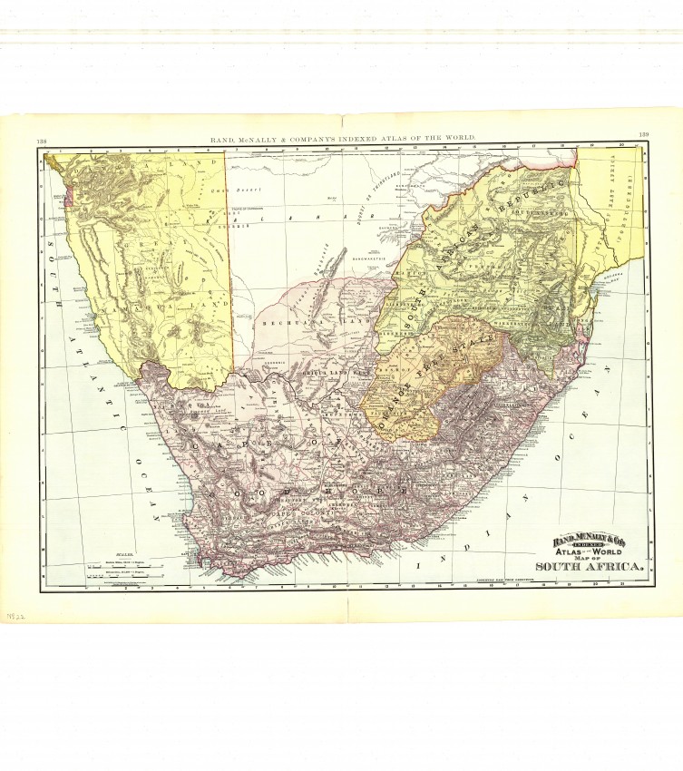 This map is a fine, 1892 production for the Indexed Atlas of the World by the famous Rand McNally Company. The map is of Africa south of 22 degrees south. In the west, tody's Luderitz in Angra Penguena and Shark Island, later notorious for the genocide of Hereros and Namaquas, is identified. The Cape Colony, Orange Free State and South African republic are colour coded as are what became the German (South) West Africa and Mozambique. Griqualand and Zuluand are incorporated in the Cape Colony and Vrijheid in the SAR.