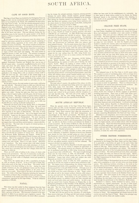 The verso of the map is a page of text on the history and political and developmental geography of South Africa as understood in 1892 from a colonial perspective - it is fascinating reading (and an image has been provided).