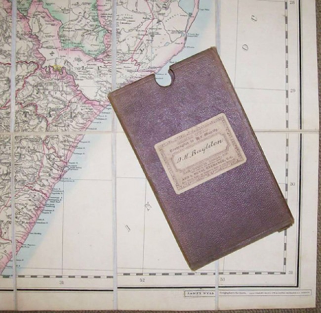 Contained in the original cardboard holder covered with brown/maroon pebble grained cloth with the label "Jeppe's Transvaal" on the side and the James Wyld label on the upper side. See image where this holder is placed on the right hand bottom corner of the map, which bears the legend: " James Wyld, Geographer to the Queen," and the Charing Cross Street address.