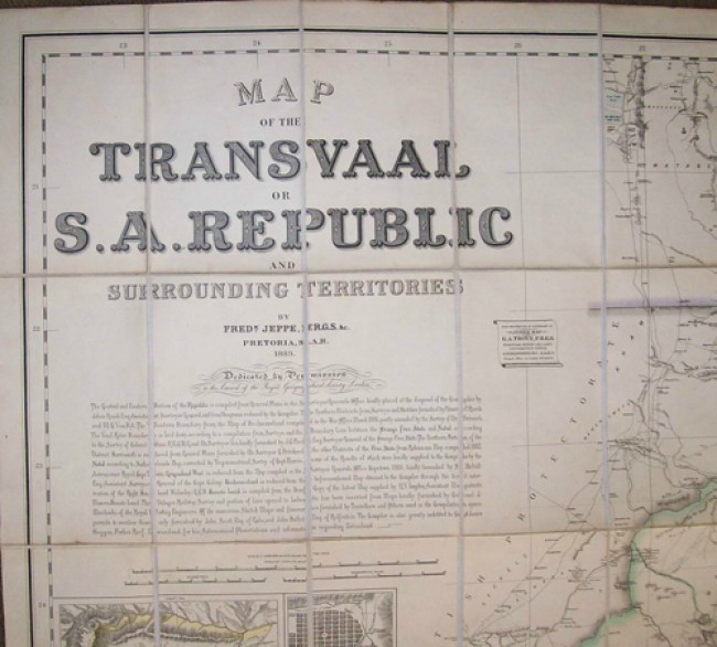 For ease of folding this map has been cut into panels mounted on linen. It is coloured in outline and has the insets of the De Kaap Goldfields, Witwatersrand Goldfields, Plan of Pretoria and Suberbs and a Portion of Zoutpansberg Goldfields.
