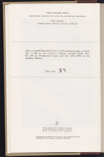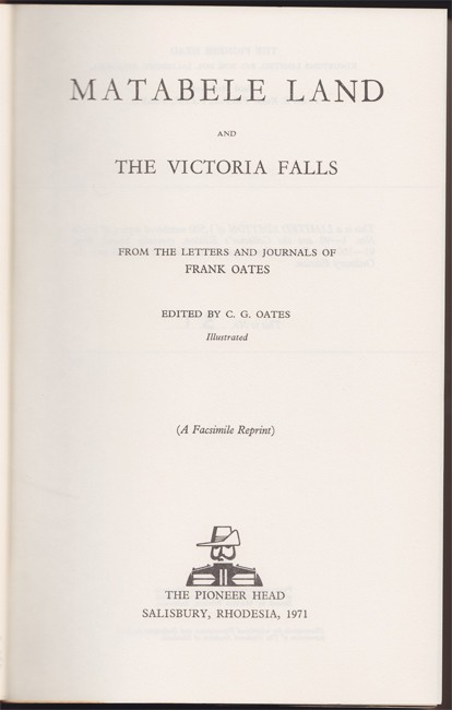 De Luxe Edition, facsimile reprint: 383 pages, colour frontispiece from the original water colour by Frank Oates (by kind permission of the National Archives of Rhodesia), 7 colour plates, many illustrations, 4 folding maps, facsimile letter from Oates to his brother Charles in a pocket at the end, facsimiles of other letters as endpapers, quarter brown leather with an orange title label on the spine, light brown cloth sides, top edge gilt, contained in a light brown cloth slip case with the design from the front cover of the original edition on the upper panel, a very good copy.