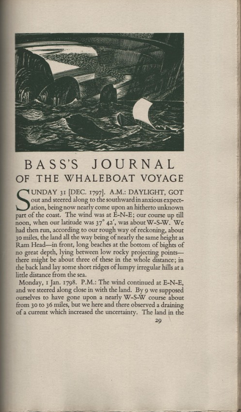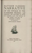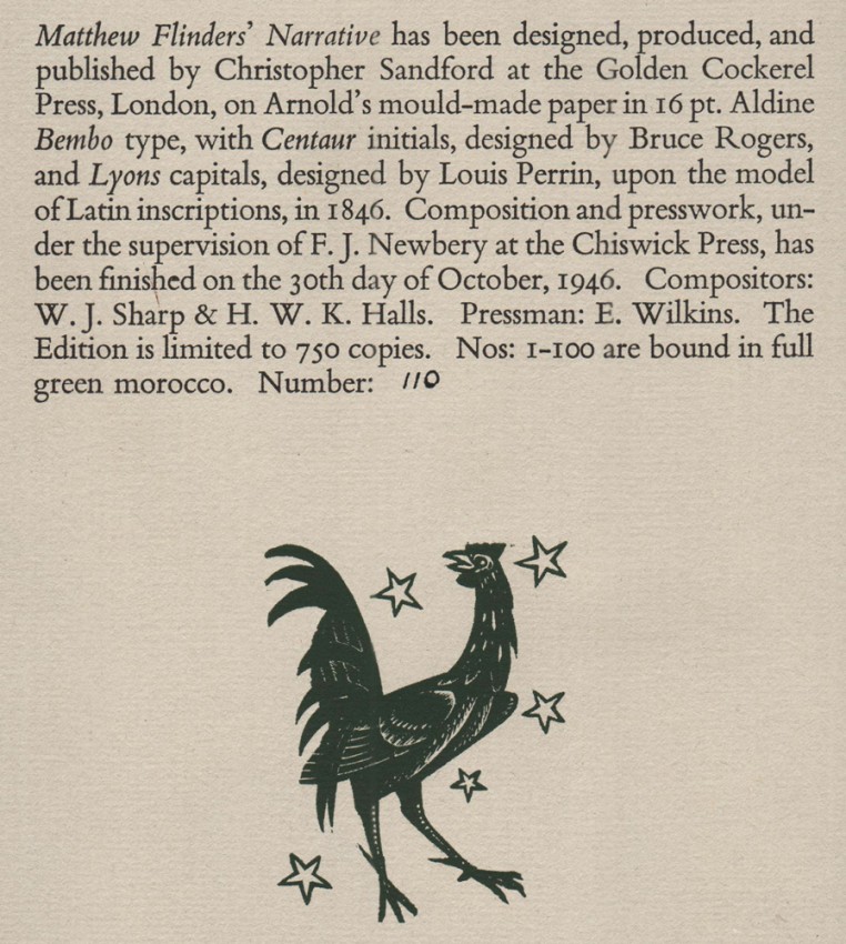 Matthew Flinders’ Narrative has been designed, produced, and published by Christopher Sandford at the Golden Cockerel Press, London, on Arnold’s mould-made paper in 16pt. Aldine Bembo type, with Centaur initials, designed by Bruce Rogers, and Lyons capitals, designed by Louis Perrin, upon the model of Latin inscriptions, in 1846. Composition and presswork under the supervision of F.J. Newbery at the Chiswick Press, has been finished on the 30th Day of October, 1946. Compositors: W.J. Sharp & H.W.K. Halls. Pressman: E. Wilkins.