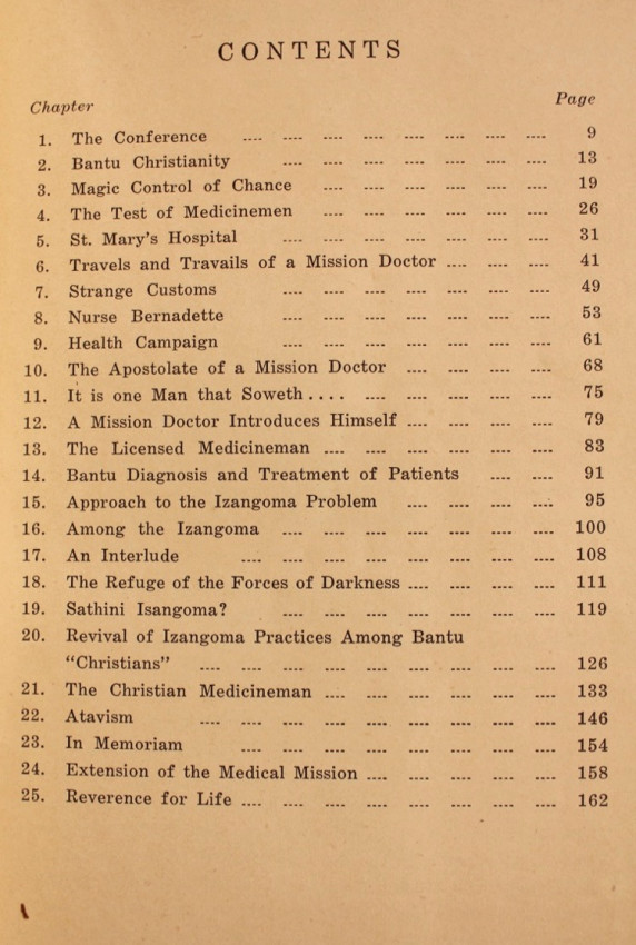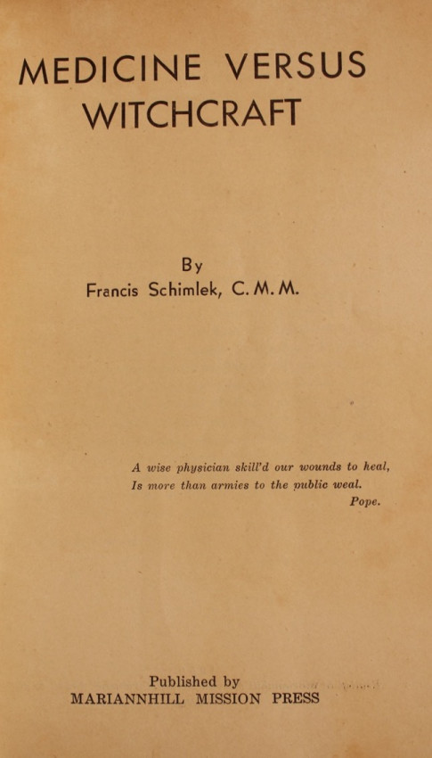 'This volume on "Medicine versus Witchcraft" does not pretend to solve problems of medicine or those of witchcraft; it is not even a history of our Medical Mission. It is but a "Story" showing to our readers what happened when medical service was added to the missionary activities of Mariannhill, and the difficulties which were experienced especially in the struggle against witchcraft, which is undoubtedly the greatest of all obstacles to a Christian civilisation and orthodox medical care among the Bantu people of Africa.'
