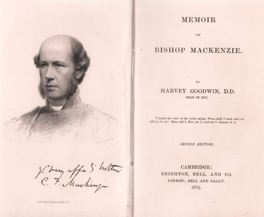 Mendelssohn (Sidney) South African Bibliography vol.1 page 947:Charles Frederick Mackenzie was born at Portmore, Peeblesshire, on April 10, 1825, and was educated at Edinburgh, Sunderland, and Cambridge University, graduating in 1848, and taking the rank of Second Wrangler. He became a Fellow of his College and was ordained in 1851, being for some time connected with the parish of Haslingfield. In 1854 Dr. Colenso offered him the position of Archdeacon to the diocese of Natal, and after some delay the offer was accepted, the episcopal party sailing on March 7, 1855, in the Jane Morice. Mr. Mackenzie was accompanied by his sister, and their letters and journals give an interesting account of the voyage. The letters to Mr. Goodwin afford much information respecting the general state of affairs in the Colony, and the dissensions in the diocese where Mackenzie remained from 1855 to 1859. hi the latter year he returned to England, and it was arranged that he should take charge of the Mission to Central Africa founded by the Universities of Oxford and Cambridge, and that he should be appointed " the first Missionary Bishop of the Church of England in modern times." He sailed for Cape Town on October 6, i860, and was consecrated at the Cathedral on January 1, 1861, the Bishops of St. Helena, Natal, and the Metropolitan of Cape Town taking part in the service.