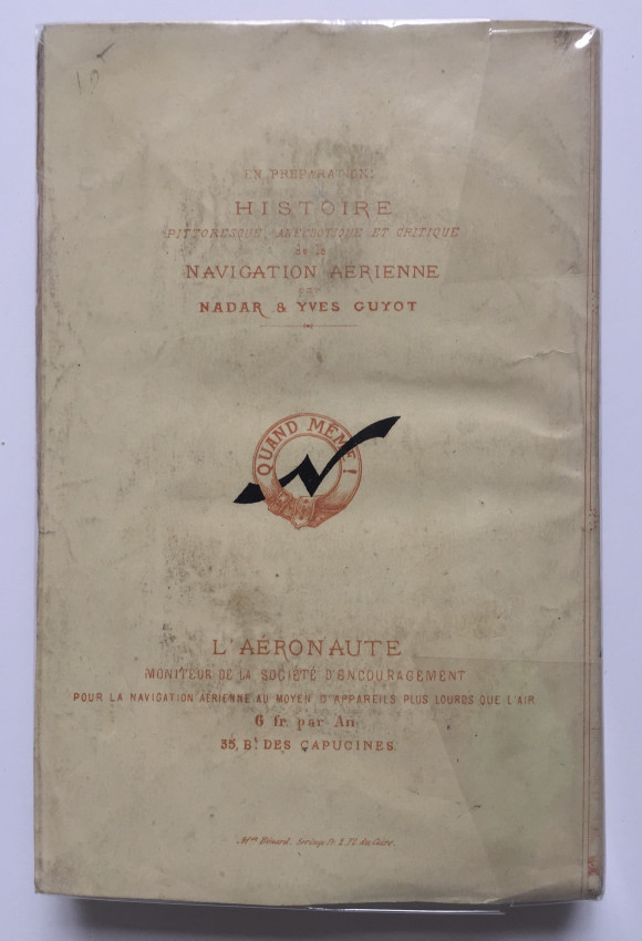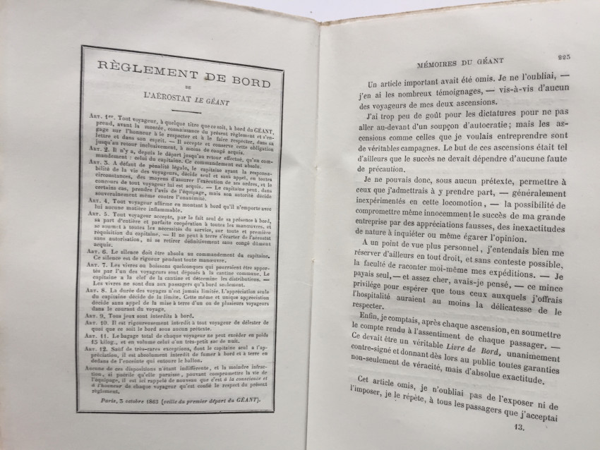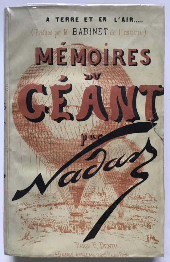 First edition: a very good copy and quite scarce in original wrappers. Nadar, in addition to being the most famous French photographer of his time, was also a caricaturist, and an almost Warhol-esque character who relished his own celebrity. He had an enormous hot air balloon, Le Geant, which came with a gondola which included a photographic studio, a print room, two cabins, a storeroom, and a lavatory: the present work describes its brief but glorious career, but including the not-so glorious crash in Hanover, in 1863, that seriously injured his wife.
