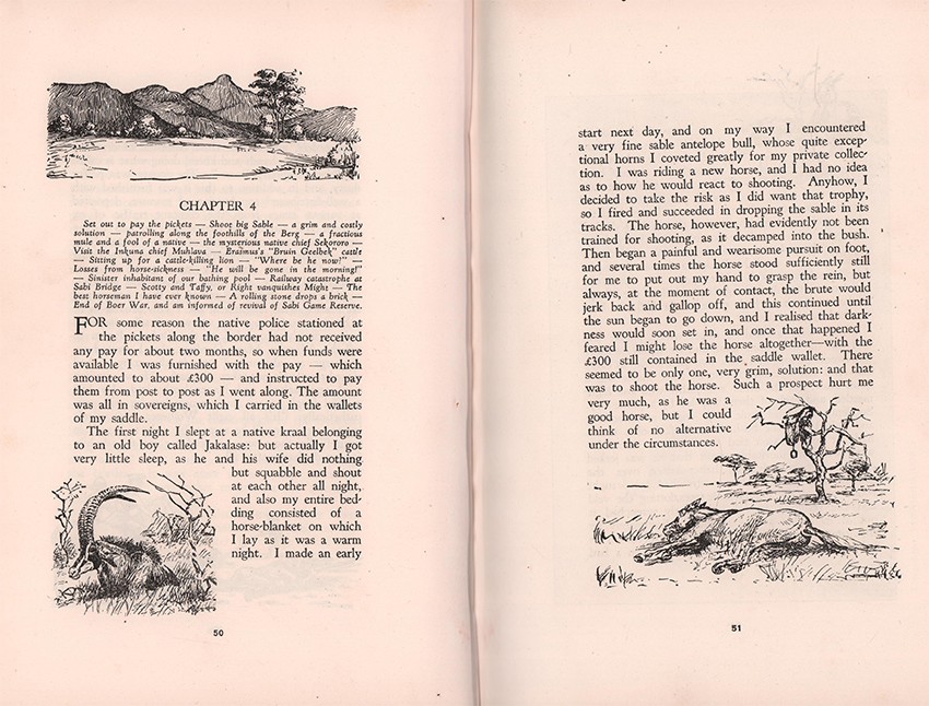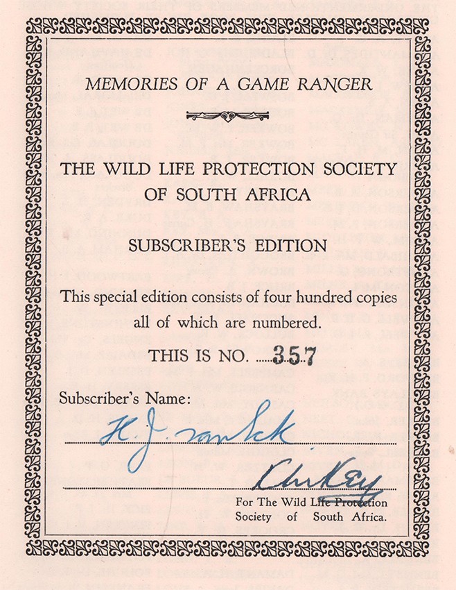 Czech (K.) An Annotated Bibliography of African Big Game Hunting Books 1785-1999 page 307: Foreword by J. Stevenson-Hamilton. Wolhuter recounts his 44 years spent as a game ranger in the Kruger National Park dealing with poachers, rogues and wild game in general. Perhaps the most famous incident occurred when he was forced to kill a lion with a knife as the beast dragged him away.