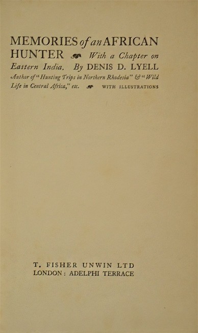 Czech (Dr. Kenneth) An Annotated Bibliography of African Big Game Hunting Books 1785-1999 (New edition 2011), page 174, βIn this autobiographical work, Lyell recounts his earliest travels in Mashonaland, heading into the interior after eland, nyala and lion. He continued in Nyasaland where he bagged kudu, lion, impala, sable and hippopotamus. He collected his first elephant using a Gibbs .303 magazine rifle (which he has only fired three practice rounds through!). Lyell devotes a lengthy chapter to his continuing elephant experiences, and includes hunts for buffalo, rhinoceros, eland and lion near Lake Victoria.β