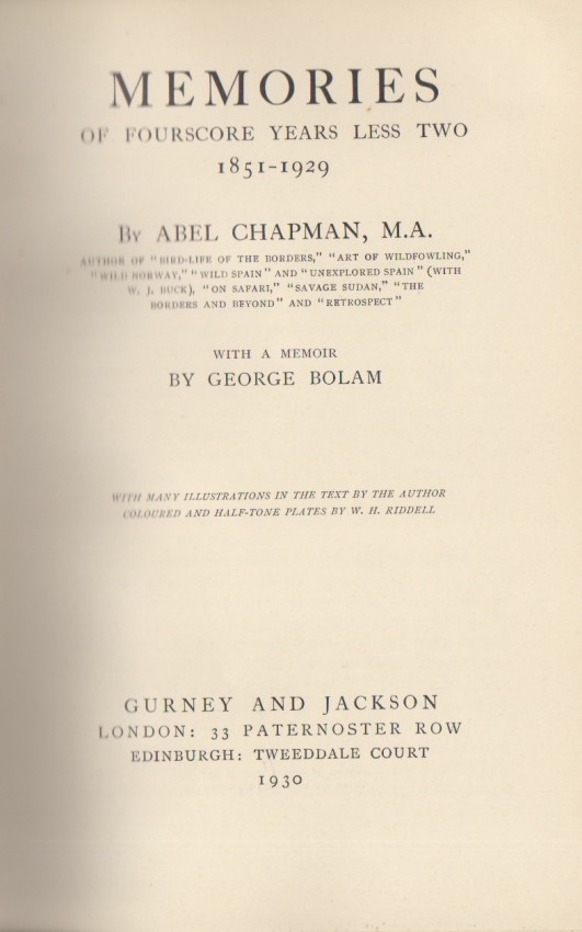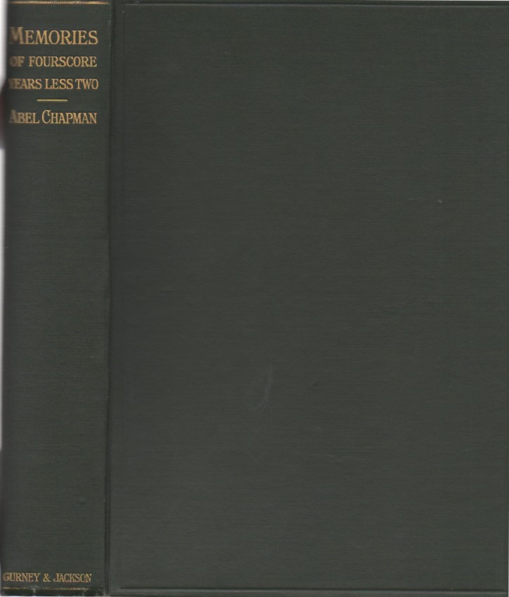 The author of SAVAGE SUDAN and ON SAFARI, Abel Chapman was not only a renowned big game hunter and sportsman, he was also a distinguished in the fields of natural history, zoology, and ornithology. This title was published posthumously and recounts in Chapman's own words his trips to the Sahara, the Nubian Desert, the Nile and later into the Sudan. Among his chapters are sections on lion, antelopes, buffalo, and numerous species of bird life not only in Africa, but also in Wild Spain, and the British Isles. Highlighting the text are 25 colored plates painted by W. H. Riddell, a photogravure of Chapman as a frontispiece, and numerous text drawings. The original green cloth is firm, bright and square. The contents are clean and crisp.