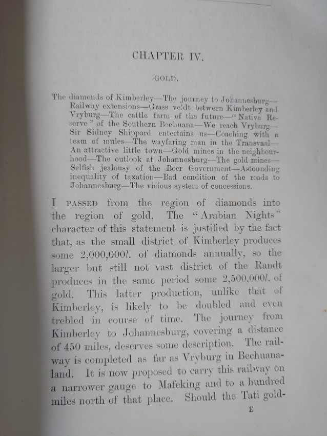 The author, a British member of parliament, travelled widely in South Africa observing the diamond operations, gold mining, sports, the native people, wildlife and comments in some detail on the political and economic conditions, having met some of the leaders there.