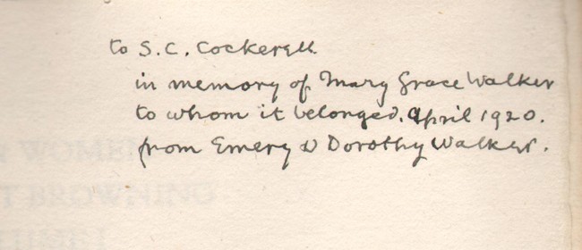 Presentation inscription on the fourth free endpaper of volume I, ‘To S.C. Cockerell in memory of Mary Grace Walker to whom it belonged. April 1920. From Emery & Dorothy Walker.’