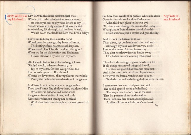 Printed by T.J. Cobden –Sanderson & Emery Walker at the Doves Press from the first edition, 1855. Number of copies printed, paper: 250; vellum: 13. Compositor: J.H. Mason. Pressmen: H. Gage-Cole, and Albert Lewis.