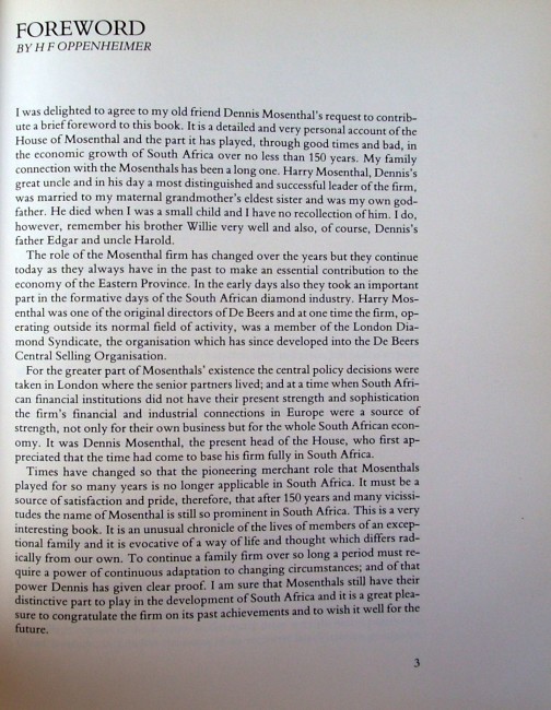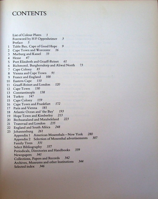 Presented by Dennis Mosenthal, Jonathan Ball, foreword by Harry Oppenheimer, chapters on places both local and international, appendicies, family trees, select bibliography, periodicals, directories and handbooks, newspapers, collections, papers ans records, archives, museums and other institutions, selected index, 356 pages, condition: very good.