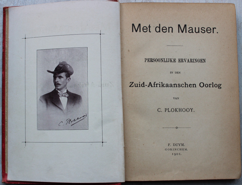 (Mendelssohn II, p. 171) "Having completed his teacher training in the Netherlands, Cornelis Plokhooy (1877-1964) arrived in the Transvaal Republic in 1897 ... From 1897 to 1899 he taught at the Oost-Eind School in Pretoria .. On the outbreak of the Second Anglo-Boer War (1899-1902) he enlisted in the Hollanderkorps under Comdt J.P. la Grange Lombard, took part at the battle of Elandslaagte (21.10.1899), and subsequently in military operations in Natal and the Orange Free State. He was captured by the enemy during the battle at Donkerhoek (12.6.1900) and sent back to his mother's country as a persona non grata. The first of several couriers sent out on secret missions by Dr W.J. Leyds, he left for Lourenço Marques (Maputo) on 31.12.1900, but while suffering from malaria was arrested in Mozambique before completing his mission. On board the Zaire and together with other Boer prisoners of war, he was sent to Portugal where he was interned in the camp at Caldas da Rainha. However, he managed to escape, and returned to the Netherlands via Lisbon, Genoa, and Trieste. His book Met den mauser: persoonlijke ervaringen in den Zuid-Afrikaansche Oorlog, in which his experiences during the war were recorded, was published in 1901." - DSAB IV, p. 465.