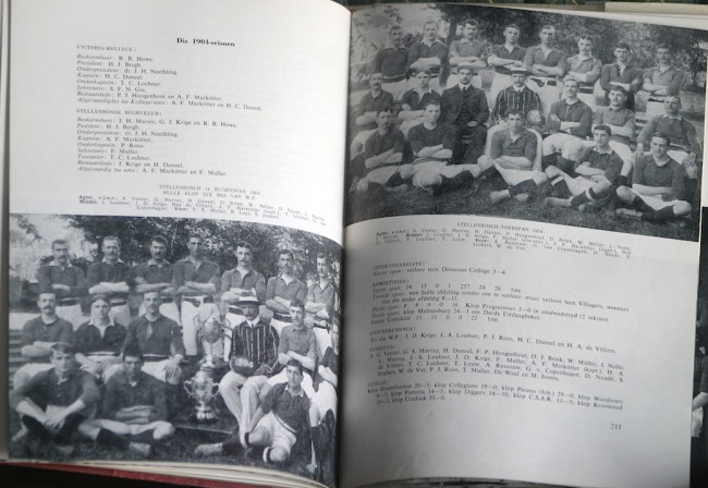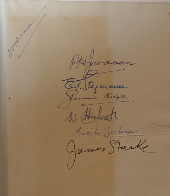 Hardcover, maroon cloth boards with gilt lettering, pp. 325, in protective brodart. End papers age toned, SIGNED by Danie Craven, Oubaas Markotter, Piet Jordaan, E Stegmann, Jannie Krige, W Herbst, Butch Lochner and James Starke.