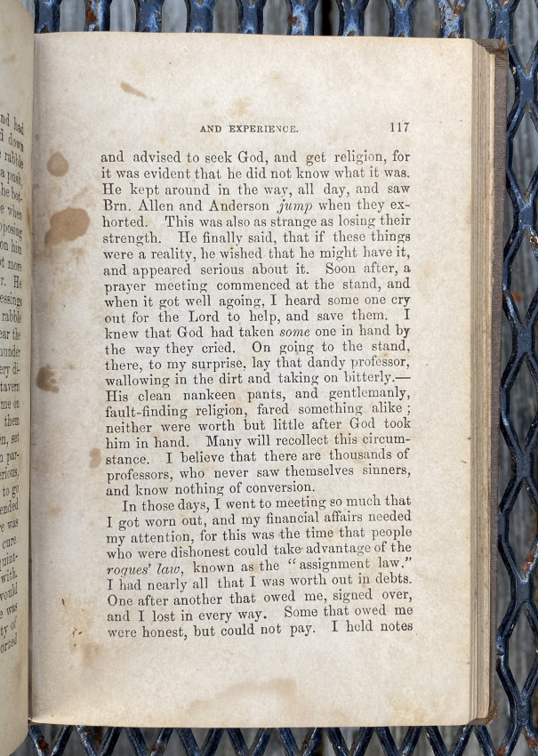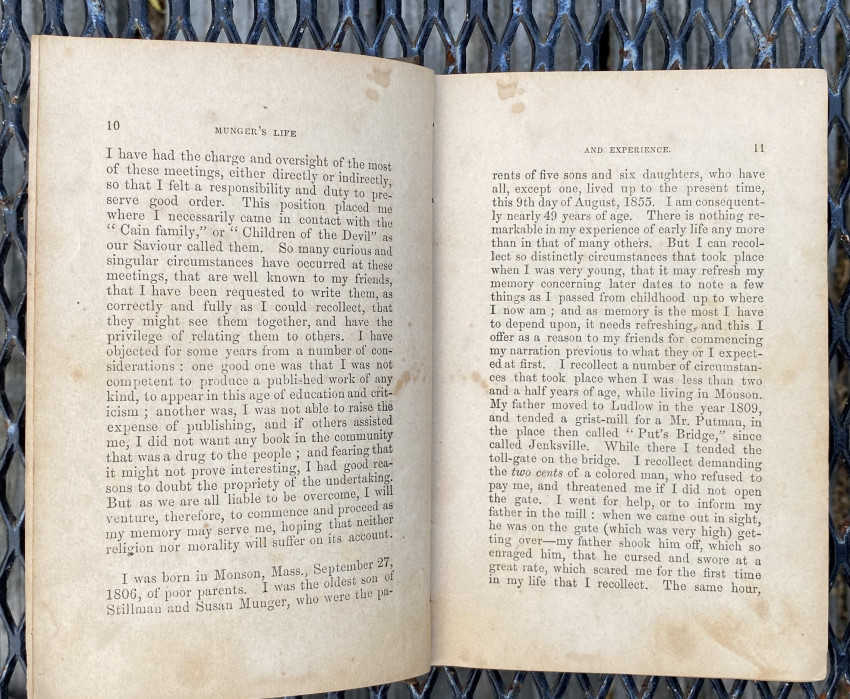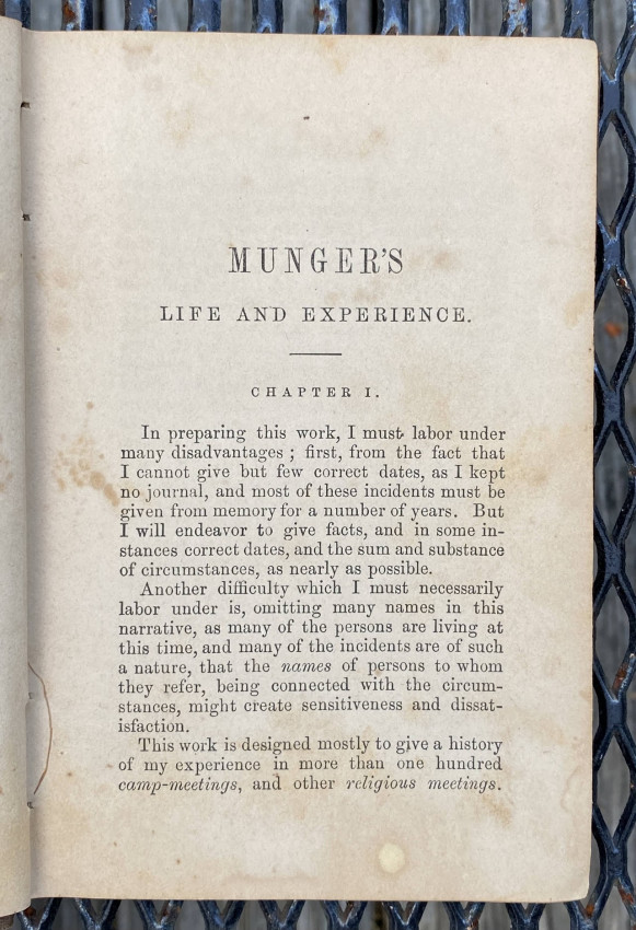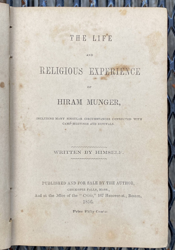 Hiram MUNGER (1806-1902). The Life and Religious Experience of Hiram Munger, Including Many Singular Circumstances Connected with Camp-Meetings and Revivals. Written by himself. Chicopee Falls, Mass.: published and for sale by the Author … and at the Office of the “Crisis”, 167 Hanover St., Boston, 1856. Duodecimo (6 ½ x 4 1/4in; 165 x 108mm). Pp [i-iv; 9-]10-180; [1-]2-25; [i-iii; i-ii; i-ii; 1-]2-3; [I; 1-]2-4. (Some staining, one leaf creased). Original brown cloth (worn, light old damp damage).
