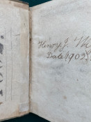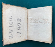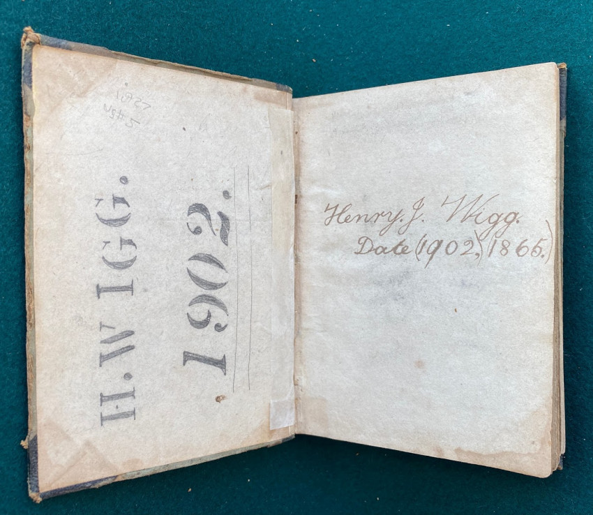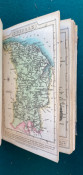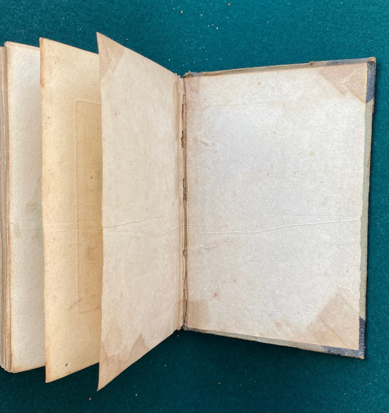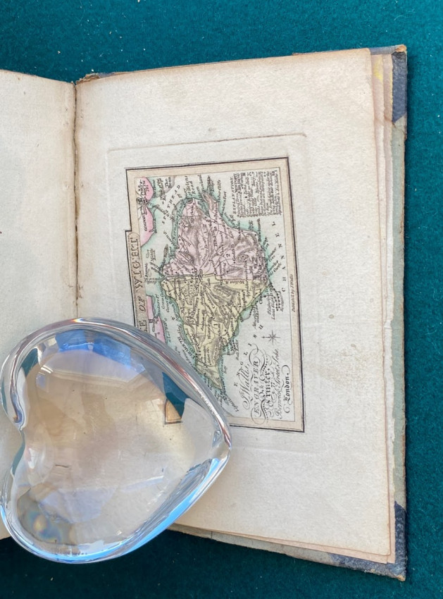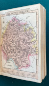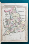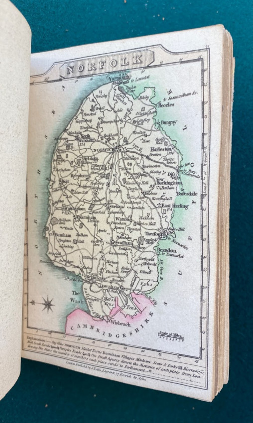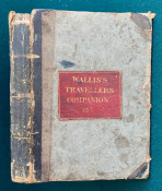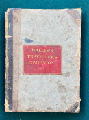[Miniature Atlas] Wallis's New Pocket Edition of the English Counties or Travellers Companion in which are carefully laid down all the direct & cross roads, cities, townes, villages, parks, seats and rivers. London: published by J. Wallis, and sold by Davies & Eldridge of Exeter, [no date, but c.1810]. 12mo (5 5/8 x 4 1/8in; 130 x 105mm). Engarved throughout: title, 'address to the public' leaf, and 44 hand-colored maps (1 double-page). (Map of Northumberland supplied from another issue, it is on thinner paper stock and ‘published by P. Martin’, clean tear to margin of ‘Cornwall’). Publisher’s blue-green half morocco, spine gilt, gilt red morocco label to upper cover “Wallis’s’ Travellers Companion 15s.” (repaired, rubbed, somewhat soiled, spine with small section lacking at head of spine). Provenance: Henry J. Wigg (inscriptions dated 1902).