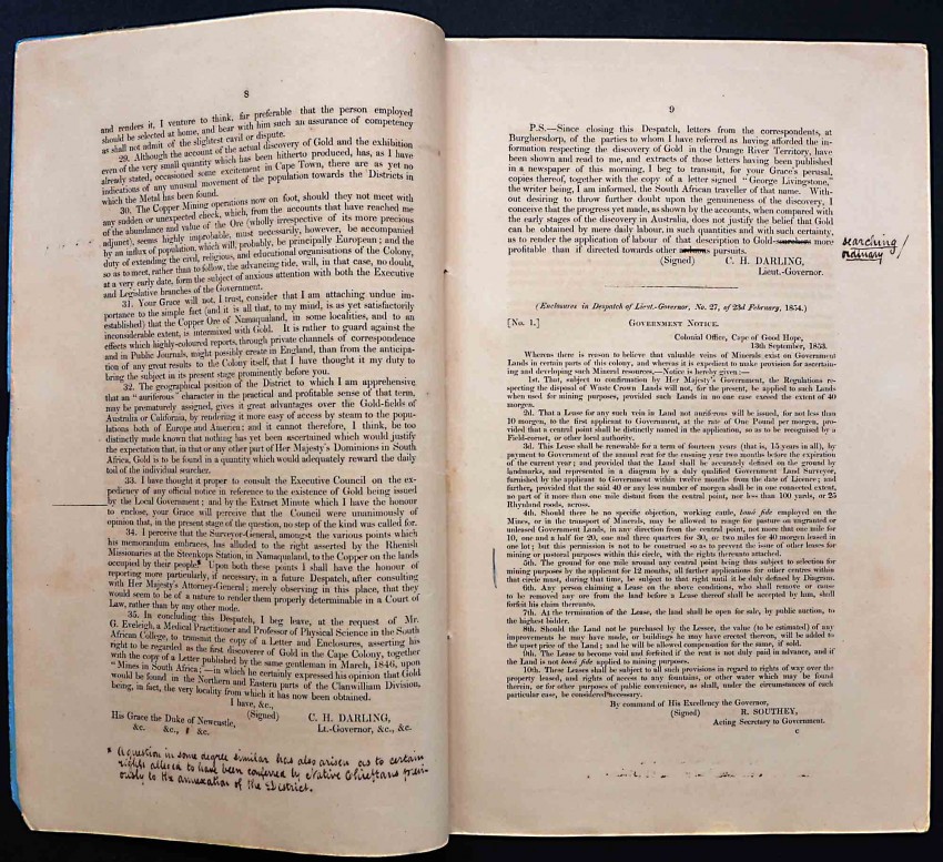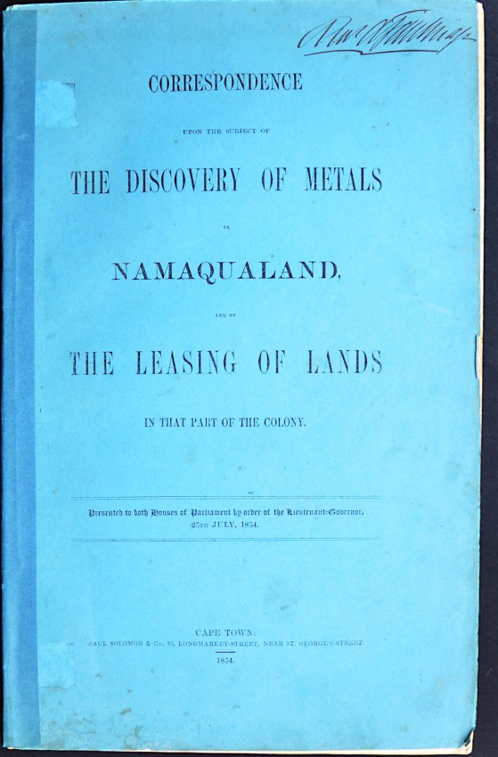 1. Correspondence upon the Subject of the Discovery of Metals in Namaqualand and the Leasing of Lands in That Part of the Colony. Presented to both Houses of Parliament 25th. July, 1854. Folio. 42pp. Original printed wrappers. Folding map.