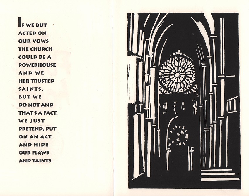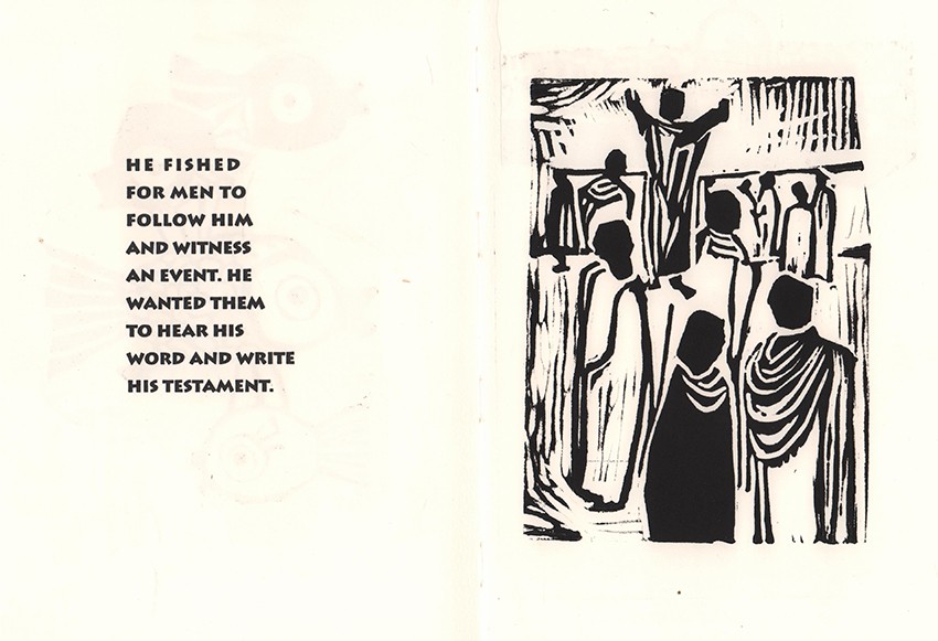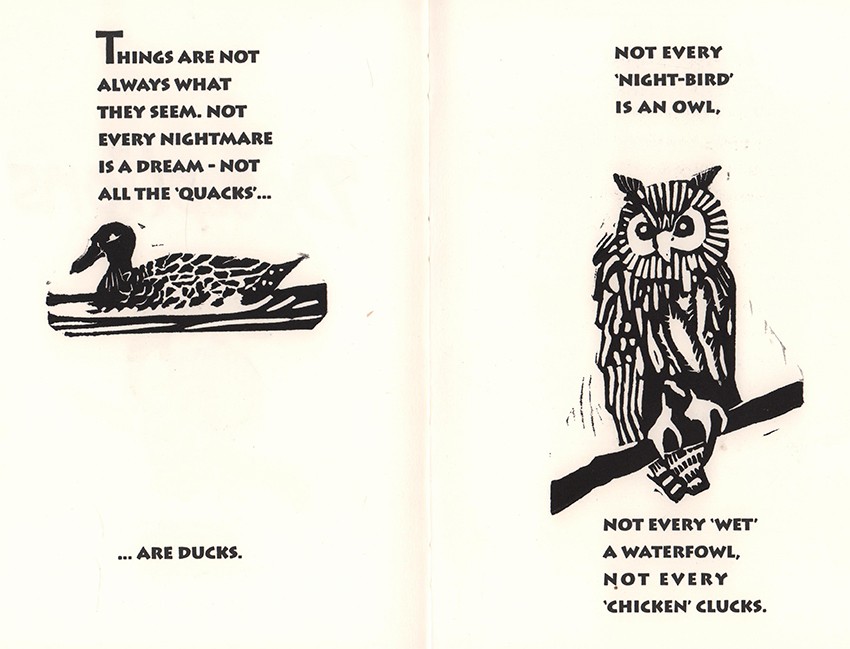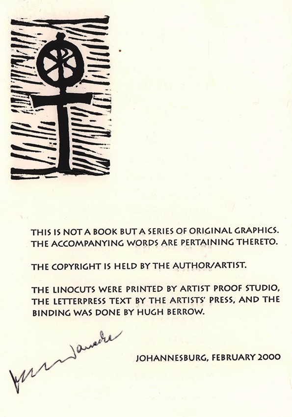 The linocuts were printed by artist proof studio. The letterpress text by the artists' press and the binding was done by Hugh Berrow.
