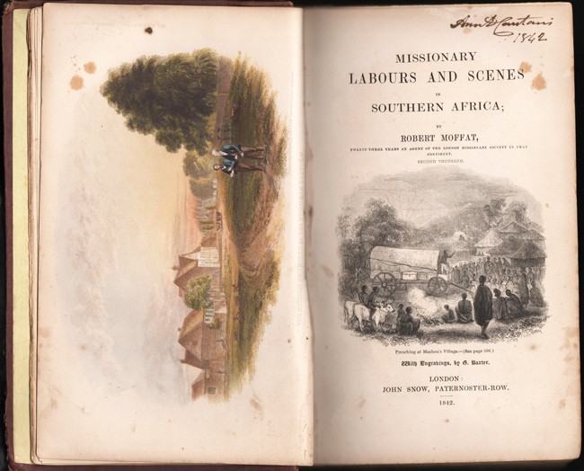 The coloured frontispiece of the Kuruman Station is one of very few illustrations printed by the Baxter process in books of African interest. This plate was also sold separately as a print to raise funds for the work of the mission.