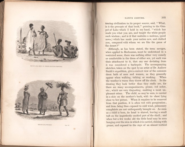 Mendelssohn (Sydney) South African Bibliography, volume 2, page 29. 'The preliminary chapters deal with opinions of the author on the origin of the Hottentots, and gives a synopsis of the early work of the London Missionary Society in South Africa, reference being made to the labours of Drs. Vanderkemp and Philip, and other pioneer missionaries who predated Mr. Moffat. The volume gives a valuable account of mission work among the Bechuanas, with notes on the customs of the natives, and a description of the earlier travels of the author... There are some particulars concerning Dr Andrew Smith's expedition into the interior in 1835, and there is an ample account of the labours of the various missionary societies engaged amongst the Bechuanas, Matabeles, Basutos and other races at this period'.