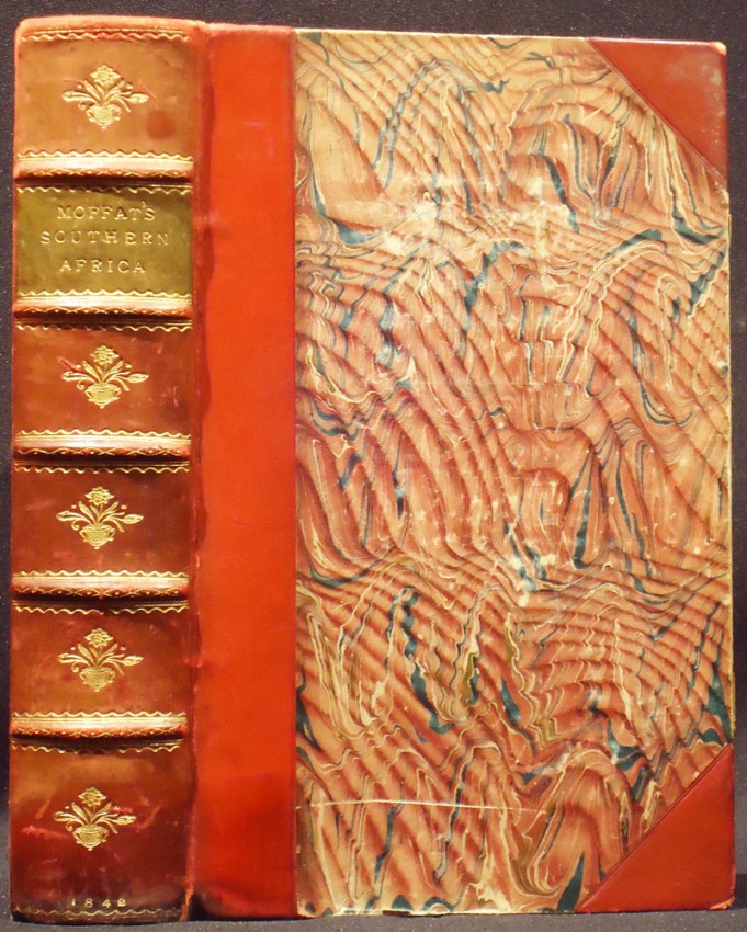 Fourth Thousand: 624 pages, colour frontispiece "The Mission Premises at the Kuruman Station" is printed by the Baxter process, title page vignette, folding map, 8 engraved plates, 8 engraved illustrations in the text, red half calf with marbled boards, top edge gilt, working loose at the hinges, watermark on the frontispiece and title page, foxing on the plates, overall a good copy.