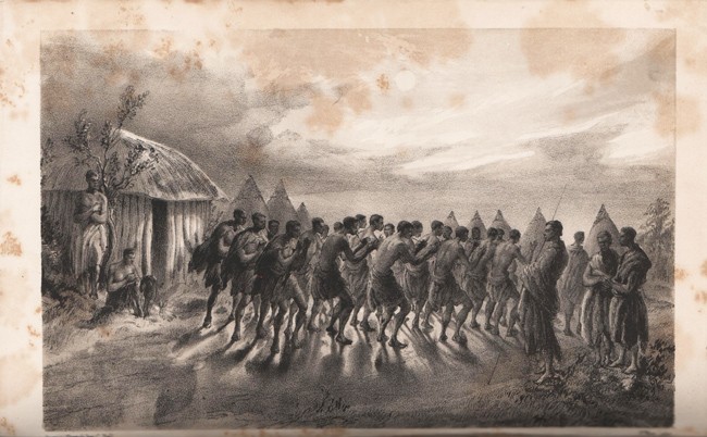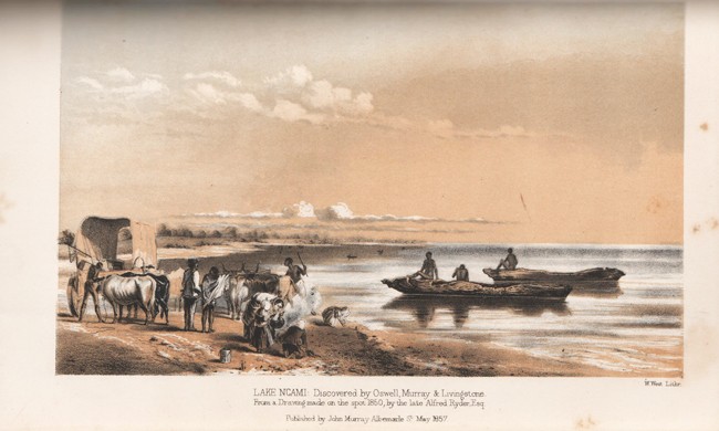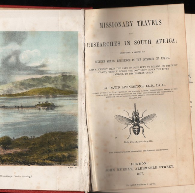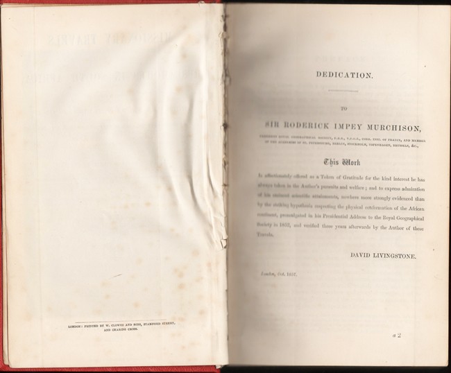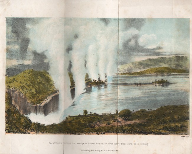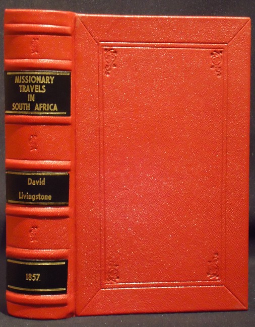 687 pages, folding lithographic frontispiece of Victoria Falls by W. West, portrait, 1 other double-tinted lithograph by West, 1 single tinted lithograph from a sketch by C. Bell and printed by West, 42 wood engraved plates and other illustrations (including a folding geological cross section of south central Africa), 2 folding maps by Arrowsmith bound in at the end, recently bound in full red leather with black title labels on the spine, marbled endpapers and edges. Tear in the lower margin of the folding frontispiece reaching the title but not the printed area, snag in the gutter between the title and dedication pages, plate at page 225 foxed otherwise the contents are bright. Overall a good copy.