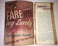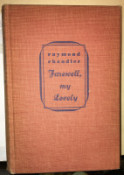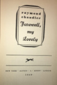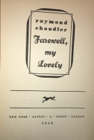 Farewell My Lovely. New York: Alfred A. Knopf, 1940. 275 pp., (1). Only front panel & flap of jacket present, with yellowed tape. Topstain faded, dust soiled. Spine ends frayed a bit, edge of lower back cover has a dent; spine faded, slightly cocked. Gutters toned, bookplate; tape shadow on blank; text clean.