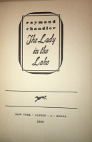 The Lady in the Lake. New York: Alfred A. Knopf, 1943. 216 pp. (1). Jacket spine ends chipped with loss, closed tear; green cloth with darker green lettering; spine ends sunned; gutters lightly toned; bookplate. Holiday Book Shop label at lower Inside back cover, 49 East 49th St., NYC. Unclipped original pictorial dust jacket by Norman Reeves.