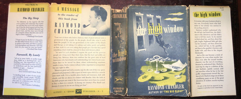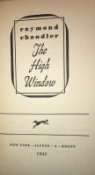 The High Window. New York: Alfred A. Knopf, 1942. 240 pp., (1). Dust jacket spine ends chipped with loss; folds creased, tender. Brown cloth with mauve stamping. Spine ends bumped. Bookplate on front endpaper. Gutters toned. Text clean. Unclipped original pictorial dust jacket by Hans J. Barschel.