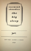 The Big Sleep. New York: Alfred A. Knopf, 1939. 279 pp., (1). Orange cloth, blue lettering. Bookplate on first blank. Spine ends frayed a little; Gutters toned, text is clean. Slightly shaken. Topstain faded. No jacket. An acceptable copy of a high spot in modern lit.