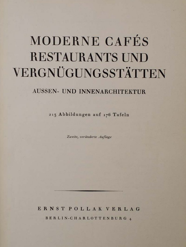 Pictorial survey of late 1920s Bauhaus and Art Deco architecture, exterior and interior design of German and foreign restaurants, bars, cafes, and dance clubs. The 188 black and white photographic plates depict the works of some of the most famous architects of the time, such as: