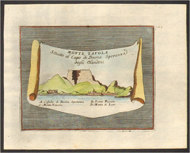 181 x 230 mm (platemark 133 x 169 mm) hand coloured copper engraved print of Table Mountain in the form of a scroll against an lined background.