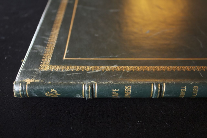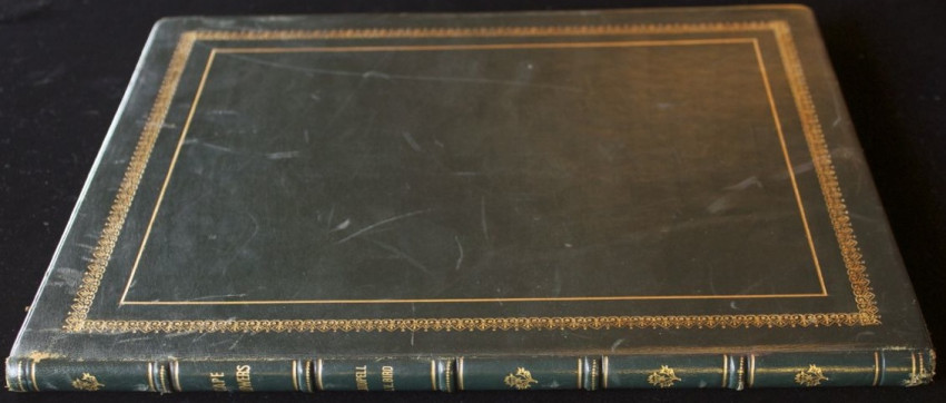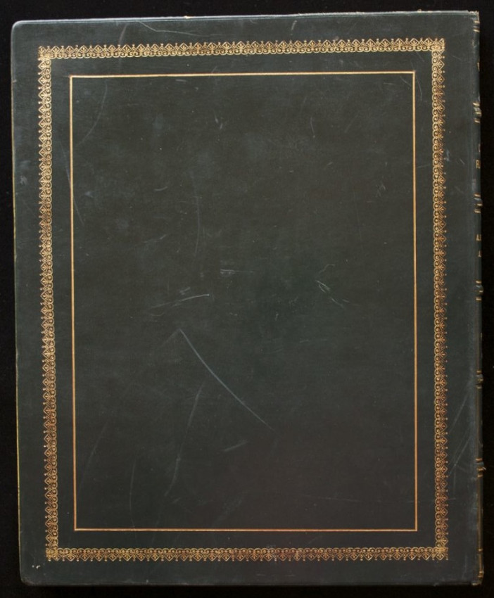 Beautiful green full leather binding with gilt lace design around borders. Five raised bands on spine. Gilt page edges. Contents clean.