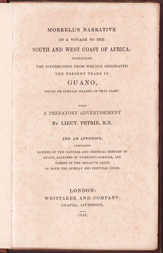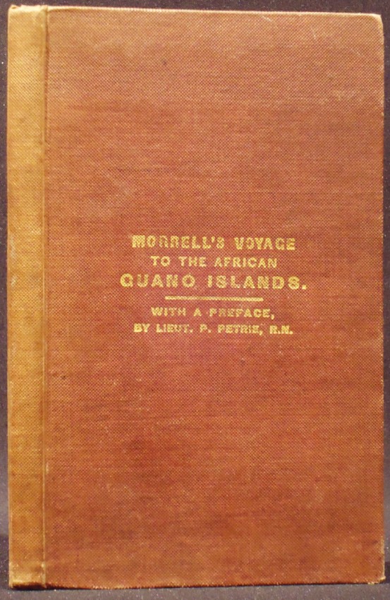 Mendelssohn (Sydney) South African Bibliography, volume 2, page 57, ‘Morrell's work consists of a narrative of four voyages, the third of which is republished in this volume, together with some other interesting matter. The trip was undertaken in the schooner Antarctic, which left New York on June 25, 1828, and there is an account of the south-west coasts and islands, with details respecting the natural features of the places visited, and the instructions given for the navigation of the shores. There is also a description of the Cape Colony, together with some information relating to the Hottentots. Subsequently the author sailed to Angra Pequena, touching at “Possession Island” and “Ichaboe” the celebrated guano islands; he remarks of the latter that “the surface of this island is covered with bird's manure to the depth of 25 feet,” but although conversant with the qualities of guano, Morell does not appear to have understood its great value, and according to Lieut. Petrie, “he seems to have been but indifferently treated by his country. He was considered an enthusiast, and his plans for opening a trade to Africa were designated chimerical.”’