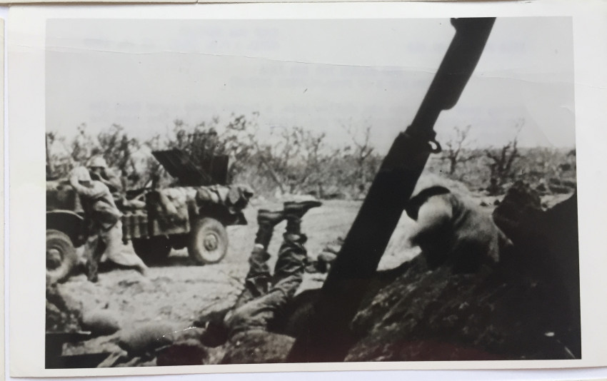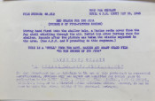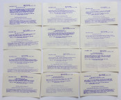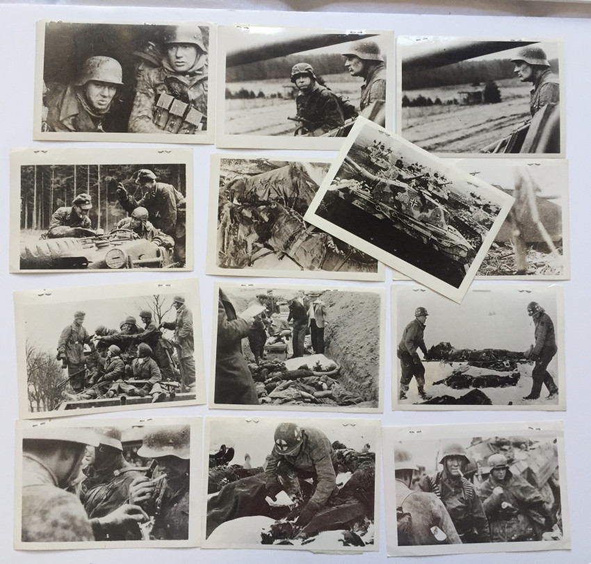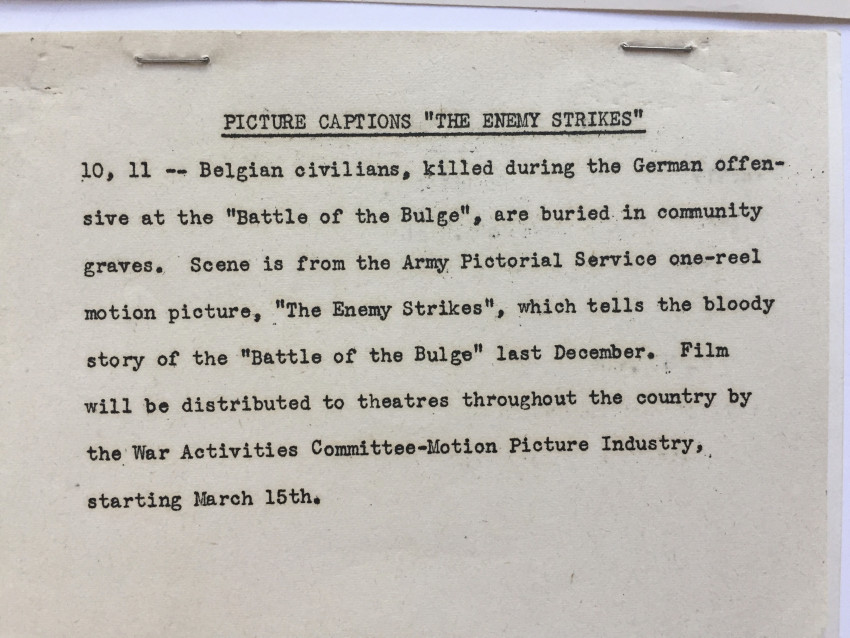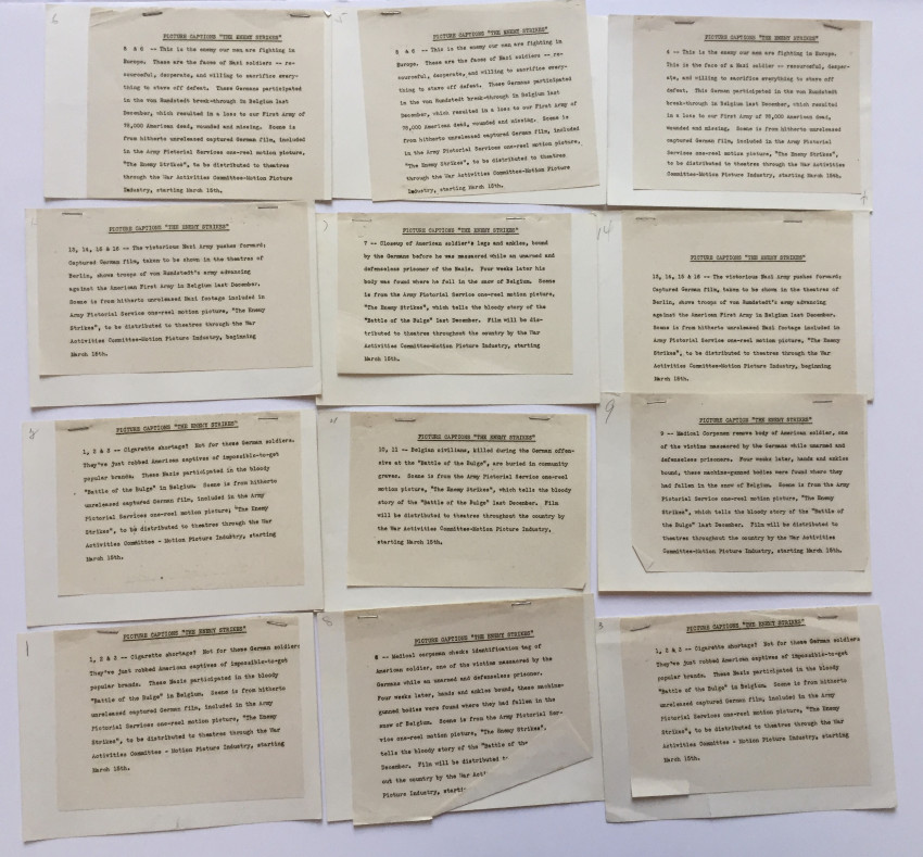 13 stills from a film called: The Enemy Strikes: The Battle of the Bulge, 1944. Mimeographed (teletype?) descriptions stapled.at upper edge. Approx. 7.5" x 5.25" (19 x13.5 cm).
