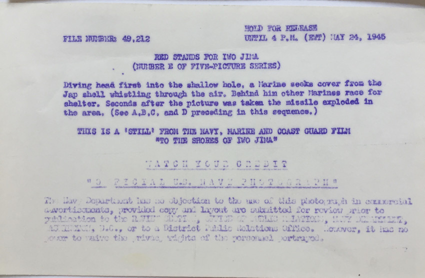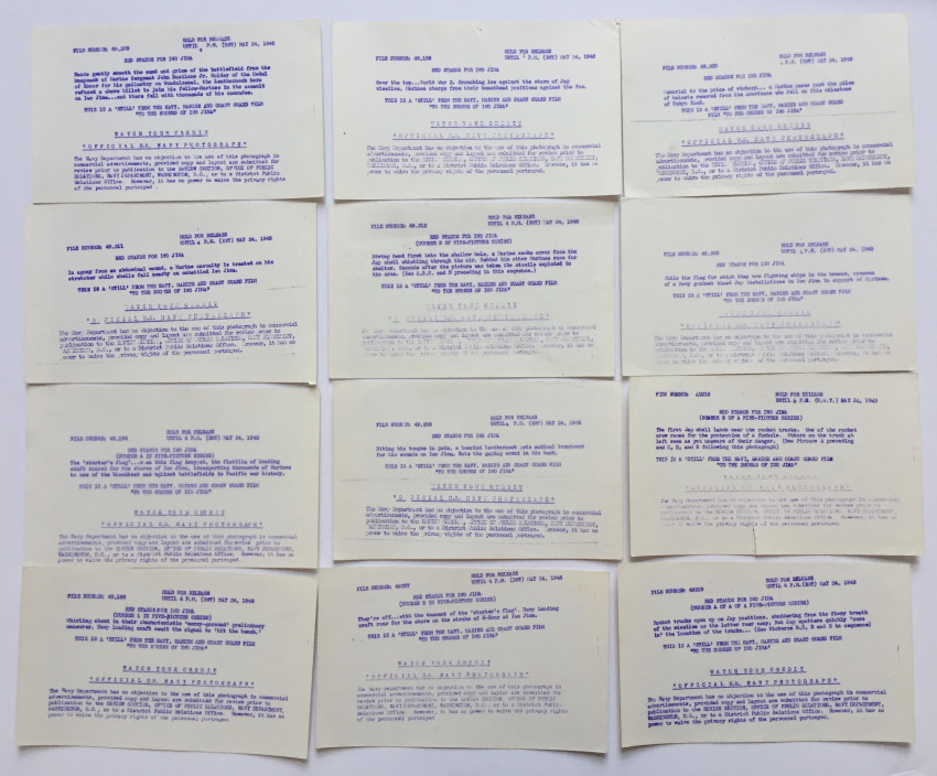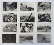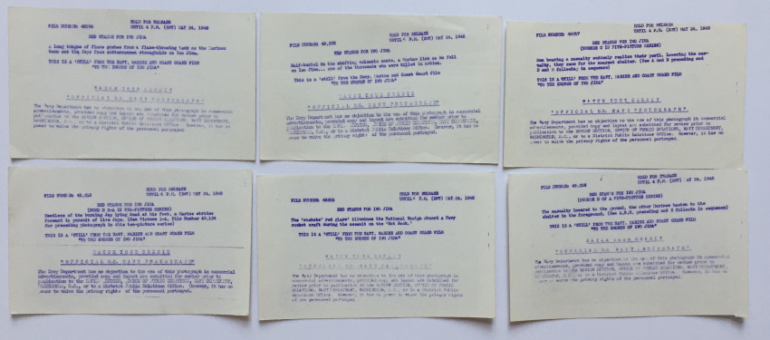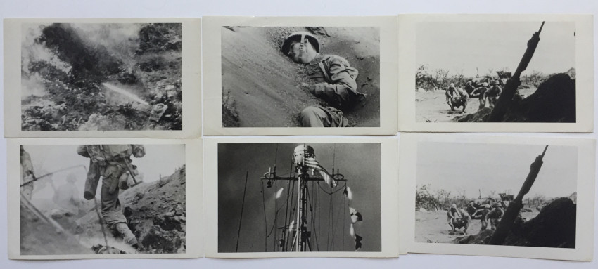(Movies) 16 images frpm the film, To the Shores of Iwo Jima, "Documentary short film depicting the American assault on the Japanese-held island of Iwo Jima and the massive battle that raged on that key island in the Allied advance on Japan." (IMDB) Contemporary printing, not common; minor wear. Approx. 8.5" x 5.25" (21.5 x 13.5 cm)