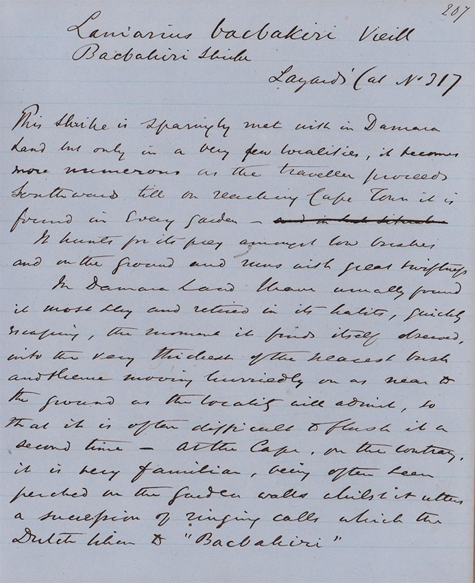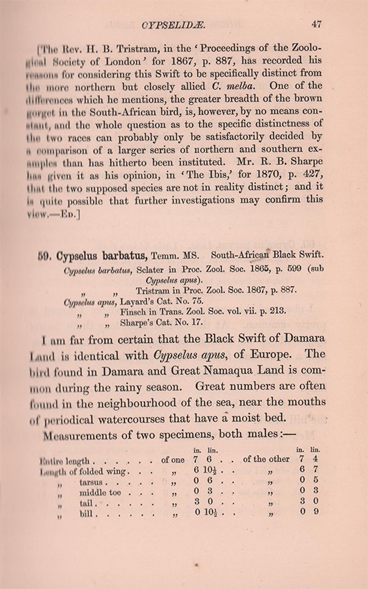 Each bird described in the notebooks has a reference to Layard, Sharpe, Gould or Le Vaillant: For example: No 58 Cypselus barbatus in the first notebook on leaf 75 corresponds to no 59 on page 47 in the published volume.