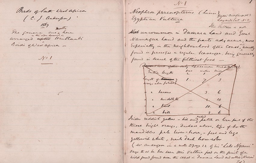 These two volumes contain Gurney's manuscript working notes for the edition of Andersson's Notes on the Birds of Damaraland and the adjacent countries of South West Africa published posthumously in 1872. The notebooks complement the printed volume and the recent printing of Baines's Birds of South Africa with descriptions from the text of Anderssons' Notes. Most importantly they represent the closest we have to Andersson's own working papers from which Gurney prepared these notes.