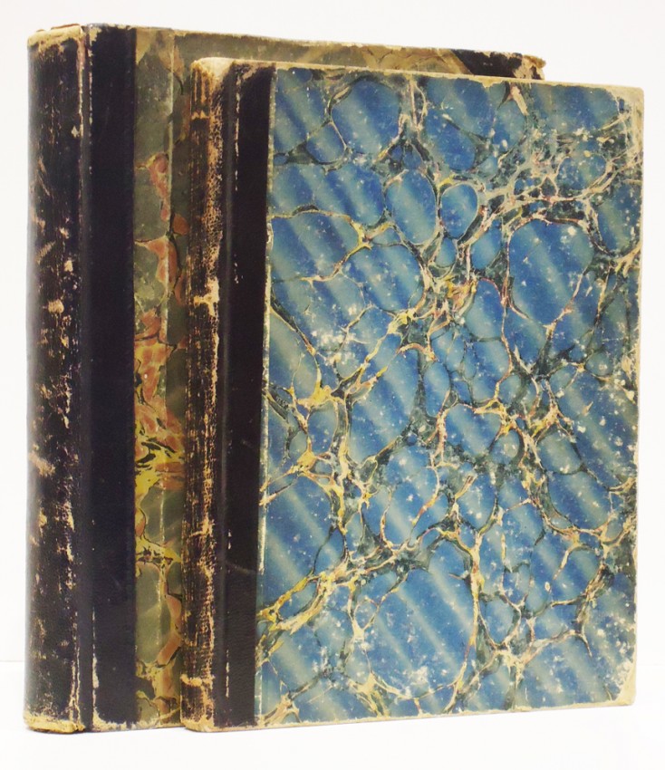 2 8vo notebooks - Vol1 1: 93 leaves numbered 1 - 93 (230 x 180 mm) with white ruled paper. Vol 2: 176 leaves numbered 94 - 269 (240 x 200mm) with unruled blue paper pages. Both are written on the recto of each page. The volumes have leather spines and marbled paper boards, the second one also has leather corners and matching marbled end papers. They are worn at the edges of the covers, the contents are bright. As working notebooks there are corrections alterations and deletions on many pages.