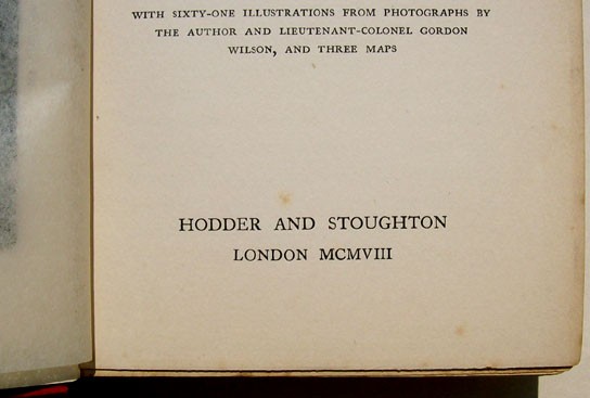Original pictorial red cloth binding with gilt titling on the spine. xiii prelims, 226 pages, 61 black and white photographic plates, 3 maps (one of which is folds out at the top) followed by 18 pages of the publisher's list of new titles.