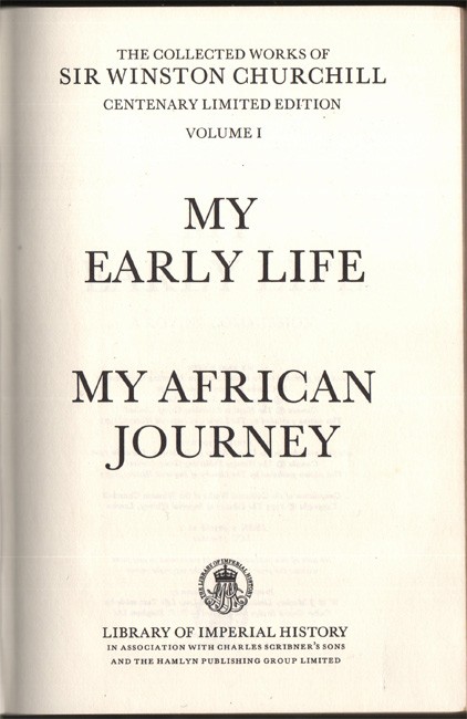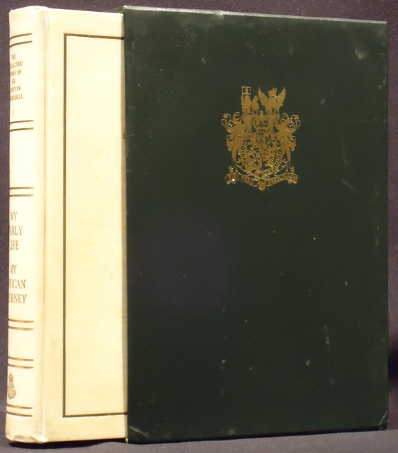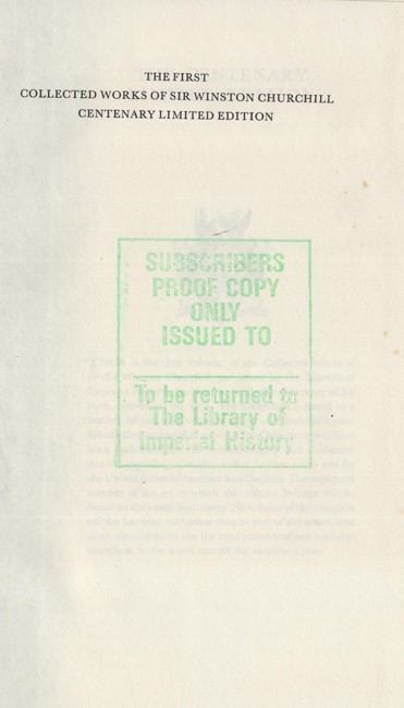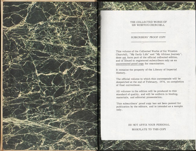 This copy bears a slip tipped onto the front free endpaper stating, 'Subscribers' Proof Copy. This volume of the Collected Works of Sir Winston Churchill, "My Early Life" and "My African Journey", does not form part of the official collected edition, and is issued to registered subscribers only as an uncorrected proof copy for examination. There is also a stamp to this effect on the half title page.