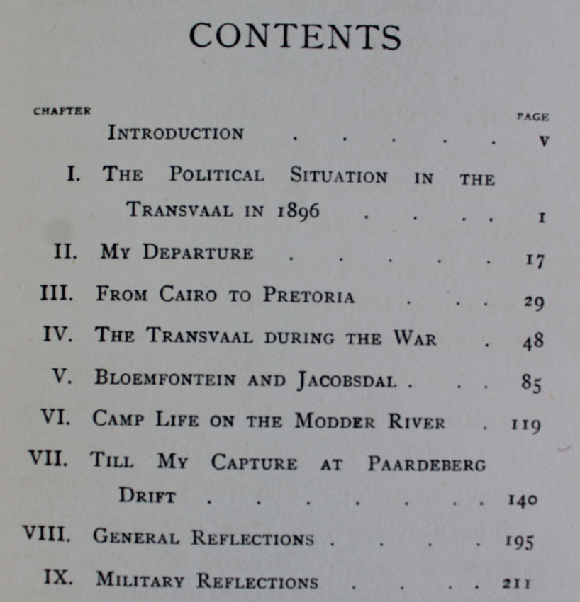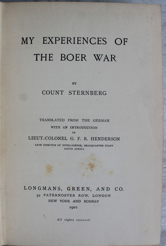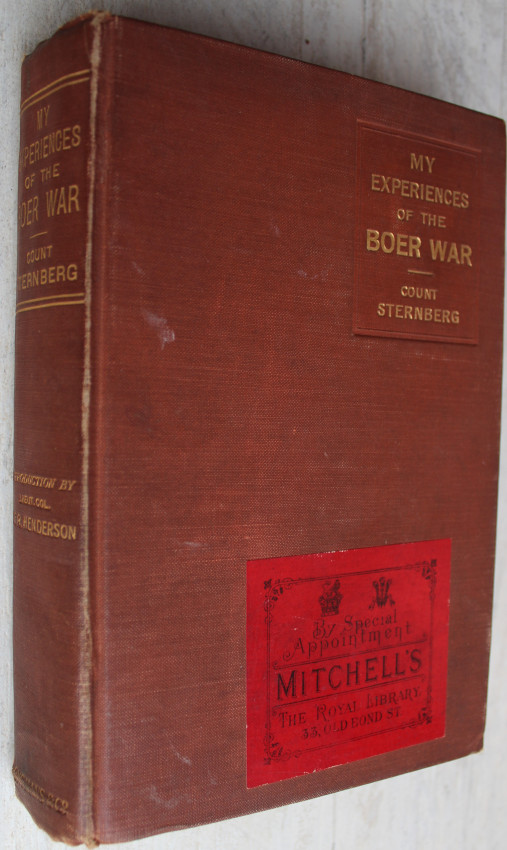 (Hackett, pp. 60, 188; Mendelssohn II, p. 434) "A narrative of travel in the Boer states during the war. The author, an Austrian, met Presidents Kruger and Steyn during visits to the Boer capitals prior to joining the republican army at the western front near Jacobsdal. As an accredited war correspondent Sternberg was allowed free movement within the war zone. He gives a description of camp life on the Modder River, recounts a visit to Boer forces surrounding Kimberley and reports events from Gen. Cronje's camp near Paardeberg. The author was taken prisoner at Paardeberg drift shortly before Cronje's surrender." - Hackett: South African War Books, p. 60.