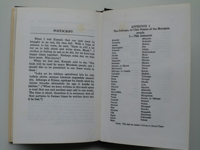 Companion volume to 'Mlimo, this being the record of Matabele life and oral tradition, and close relationship between Rev Mtompe Kumalo and his missionary colleague Dr Neville Jones, 126pp., illustrated in black and white diagrams and photographs, originally published in 1944.